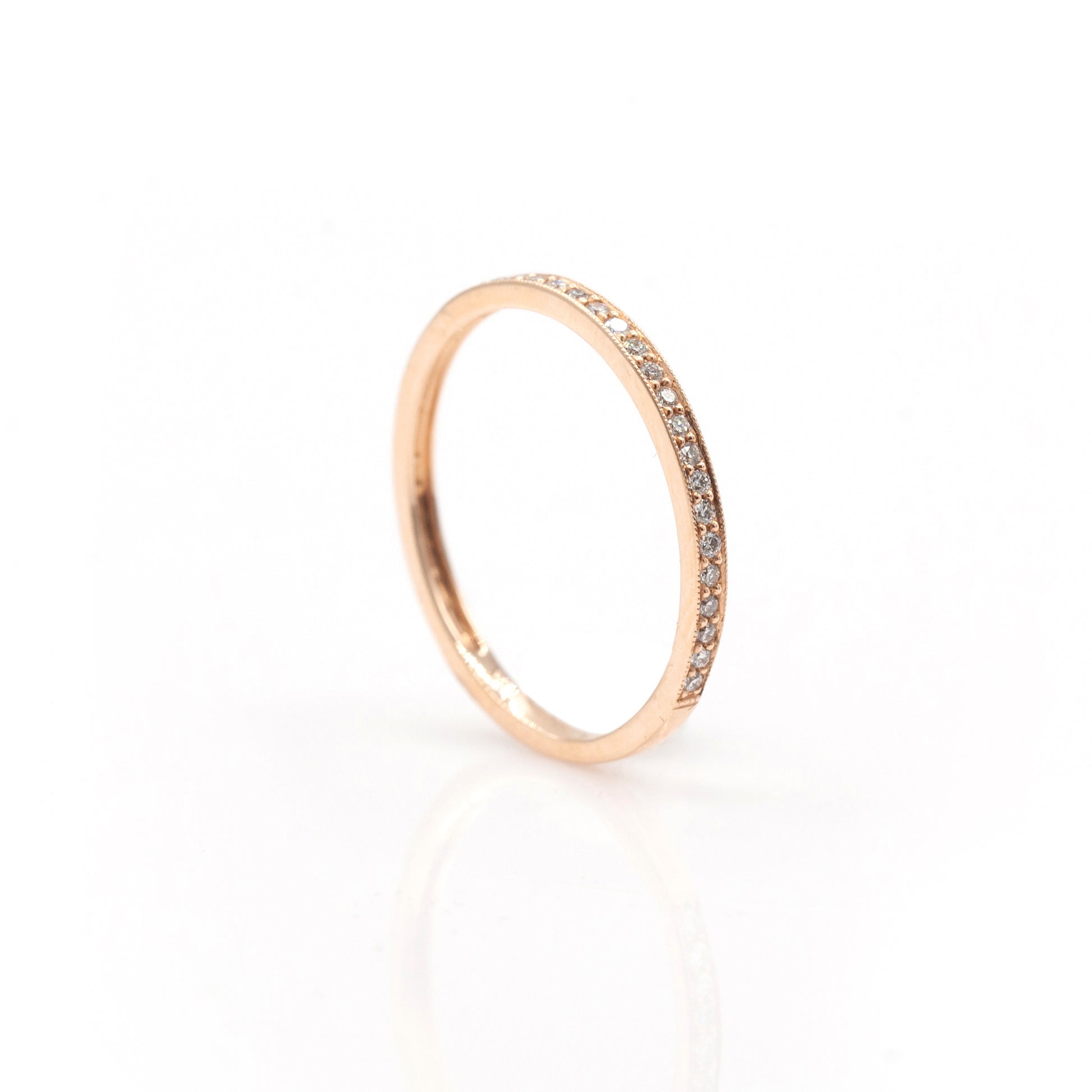 14k Rose Gold Diamond stackable band, with .17ct total weight round brilliant Diamonds set three quarters around. Detailed with a milgrained edge.