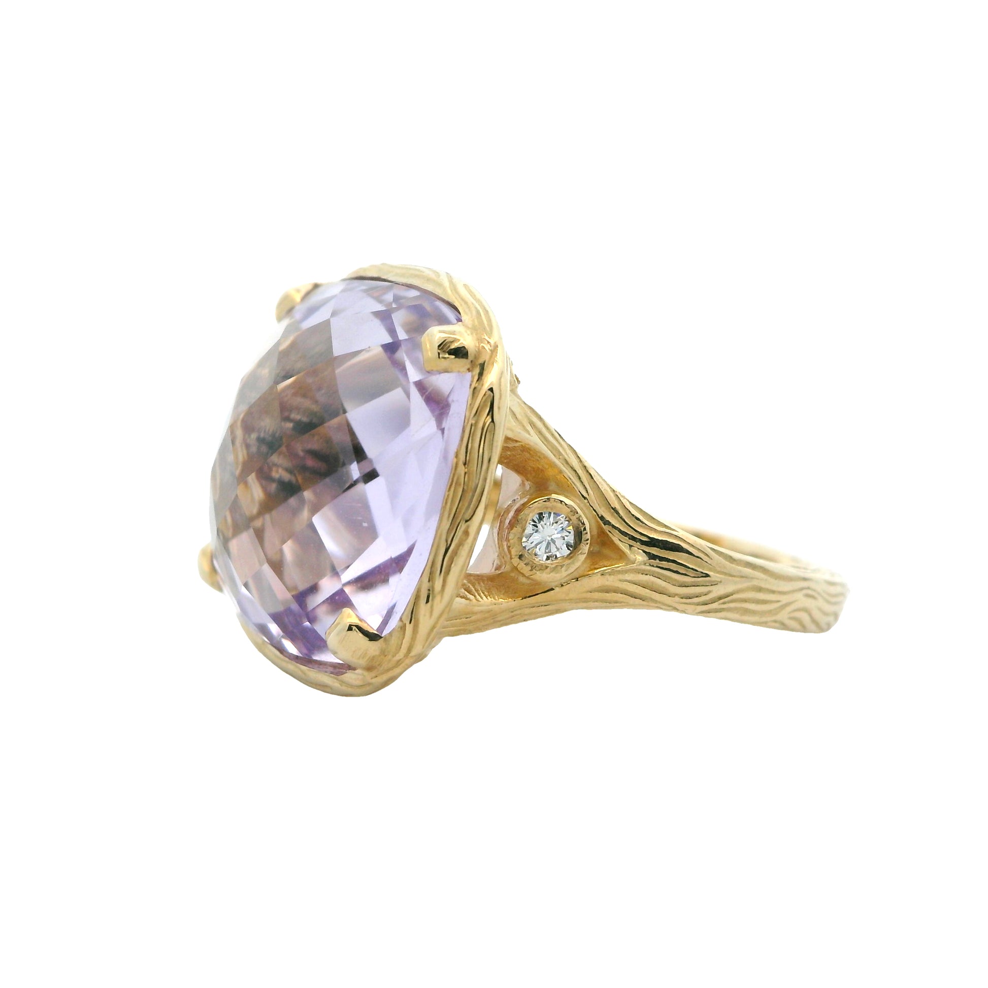 Organic branch design, featuring a stunning Rose de France, uniquely faceted into a double-sided checkerboard cushion cut.