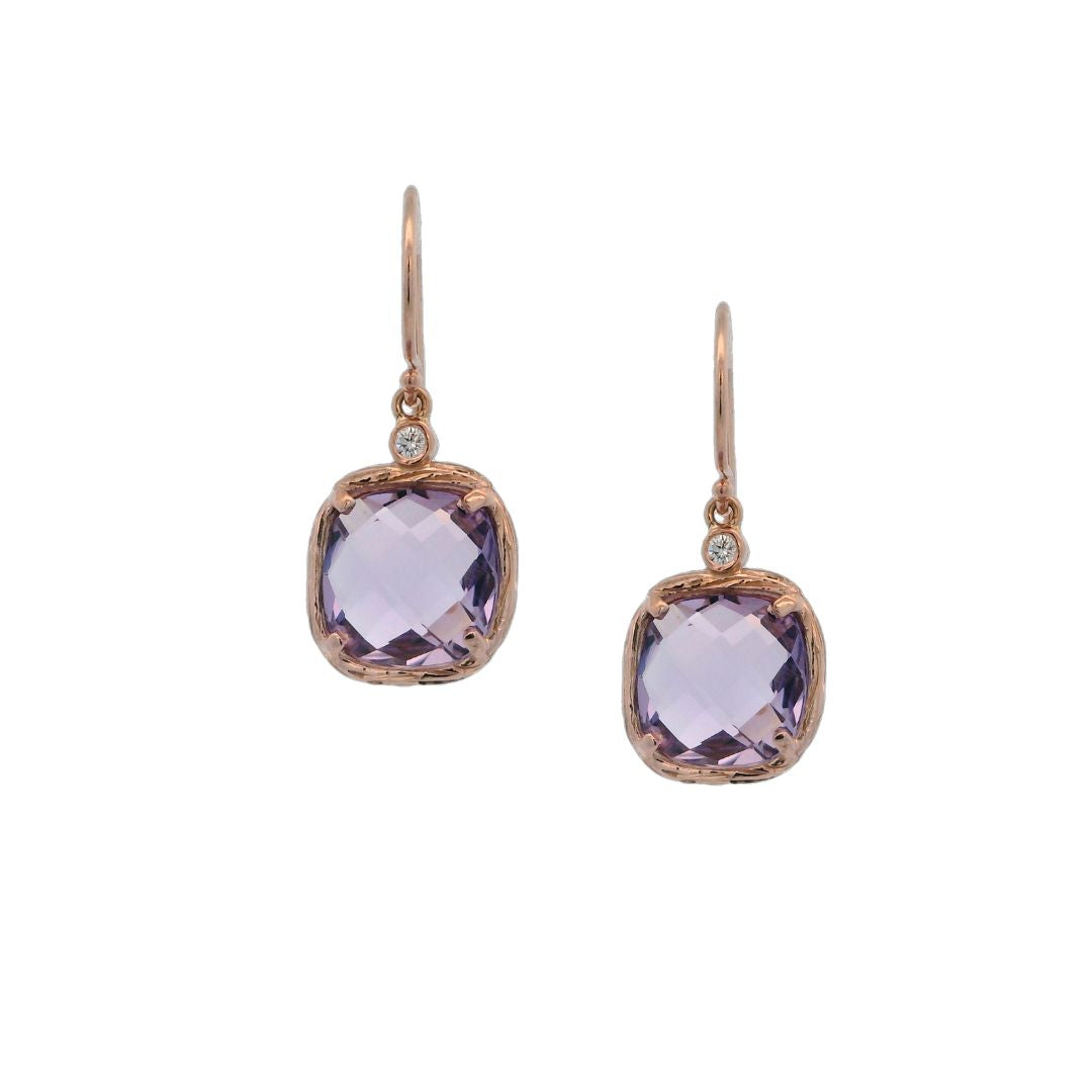 Organic design, featuring 2 stunning light lavender Rose de France stones, uniquely faceted into a double-sided checkerboard cushion cut.