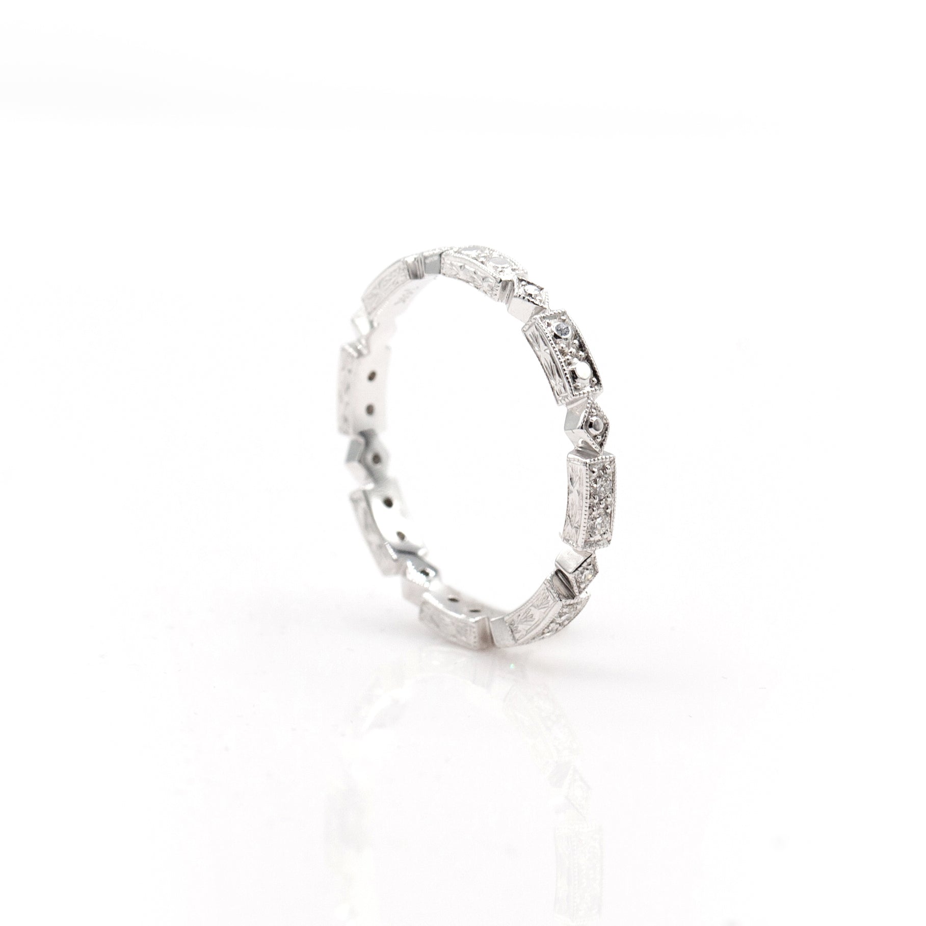 14k White Gold vintage-inspired Diamond stackable band, with .15 ct total weight round brilliant Diamonds set halfway around. Detailed with a milgrained edge.