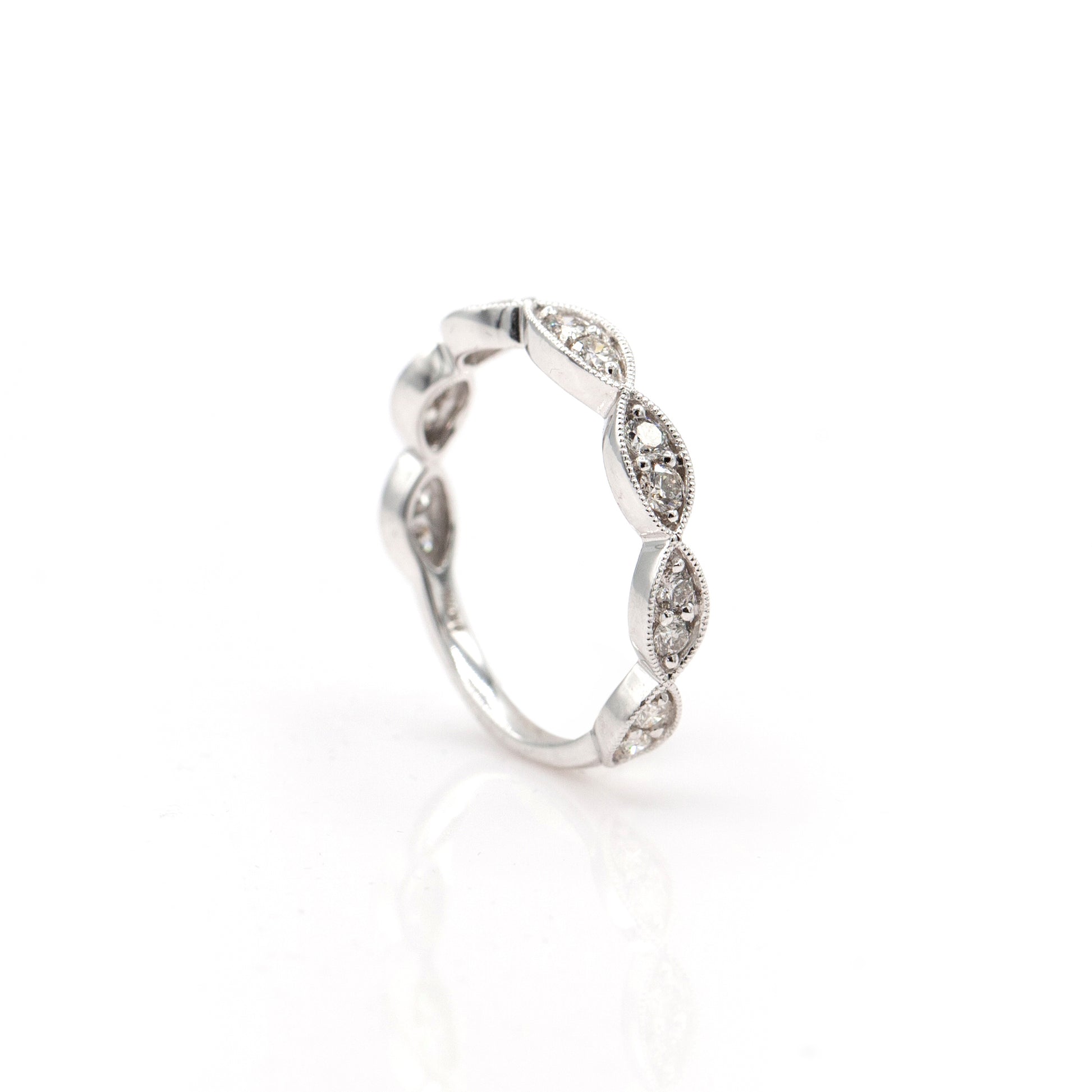 14k White Gold vintage-inspired Diamond stackable band, with .50 ct total weight round brilliant Diamonds set three quarters around. Detailed with a milgrained edge.