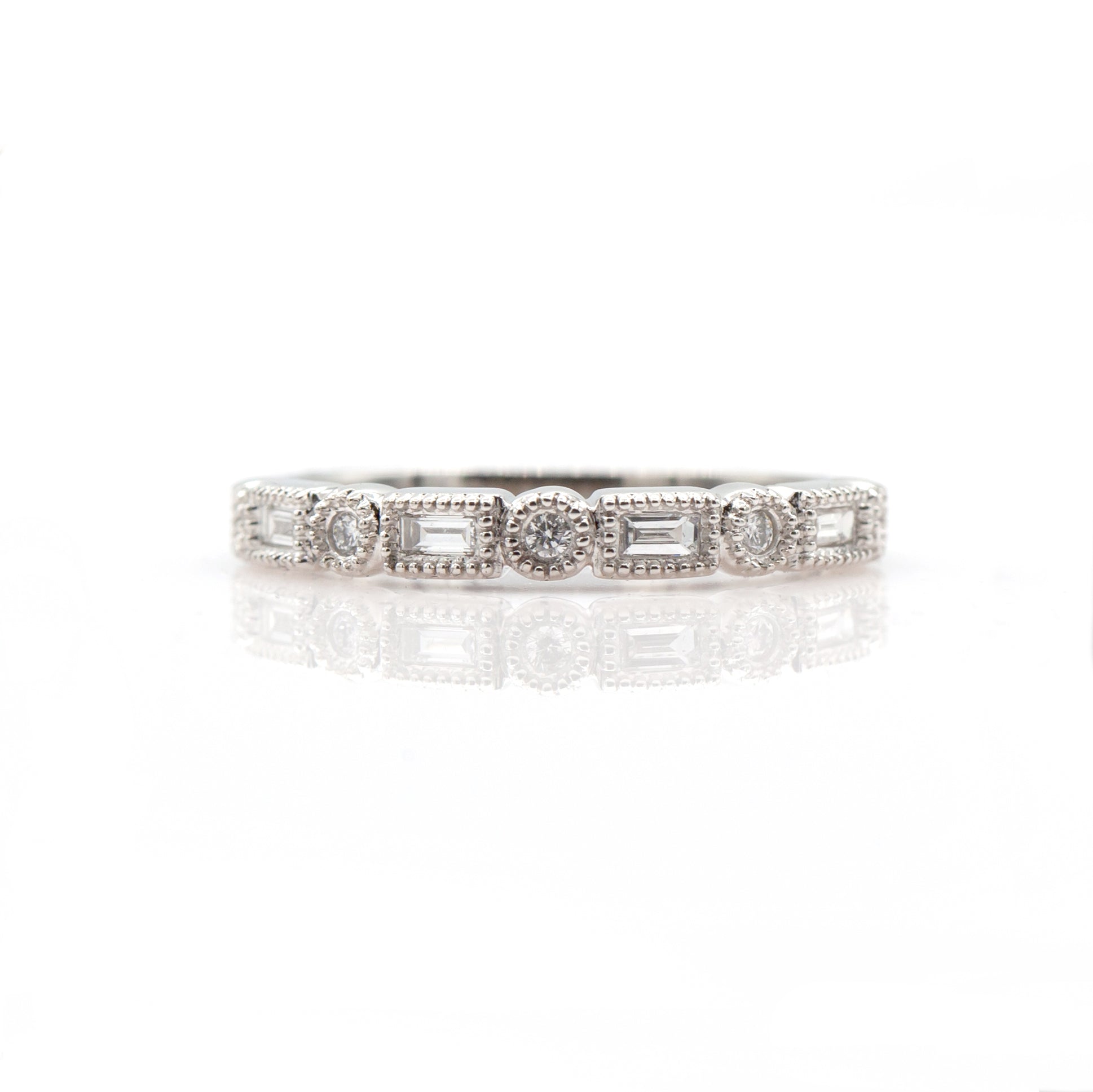 14k White Gold vintage-inspired Diamond stackable band, with .17 ct total weight round brilliant Diamonds set half-way around. Detailed with a milgrained edge.