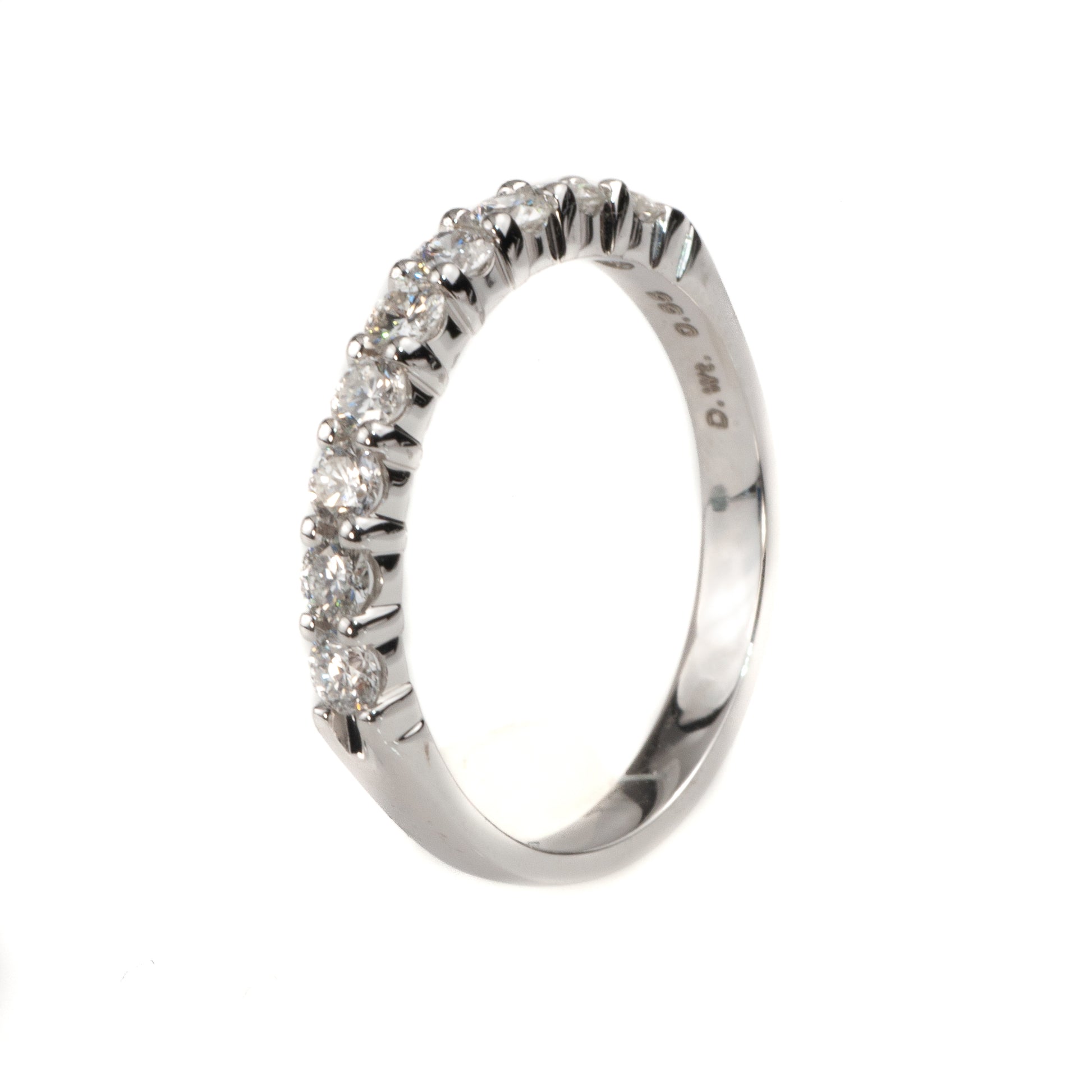 14k White Gold prong set Diamond band, with (9) round brilliant Diamonds across the top in a high polished and classic design.