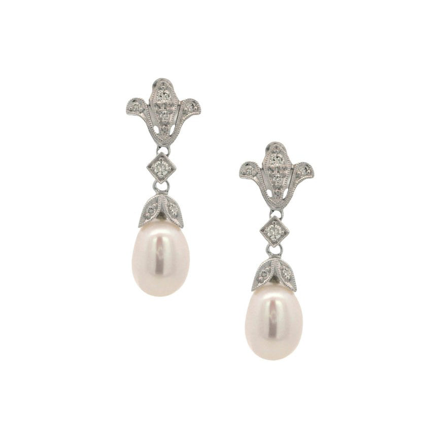 14k White Gold Art Deco Inspired 0.10ctw Diamond and Pearl Post Earrings