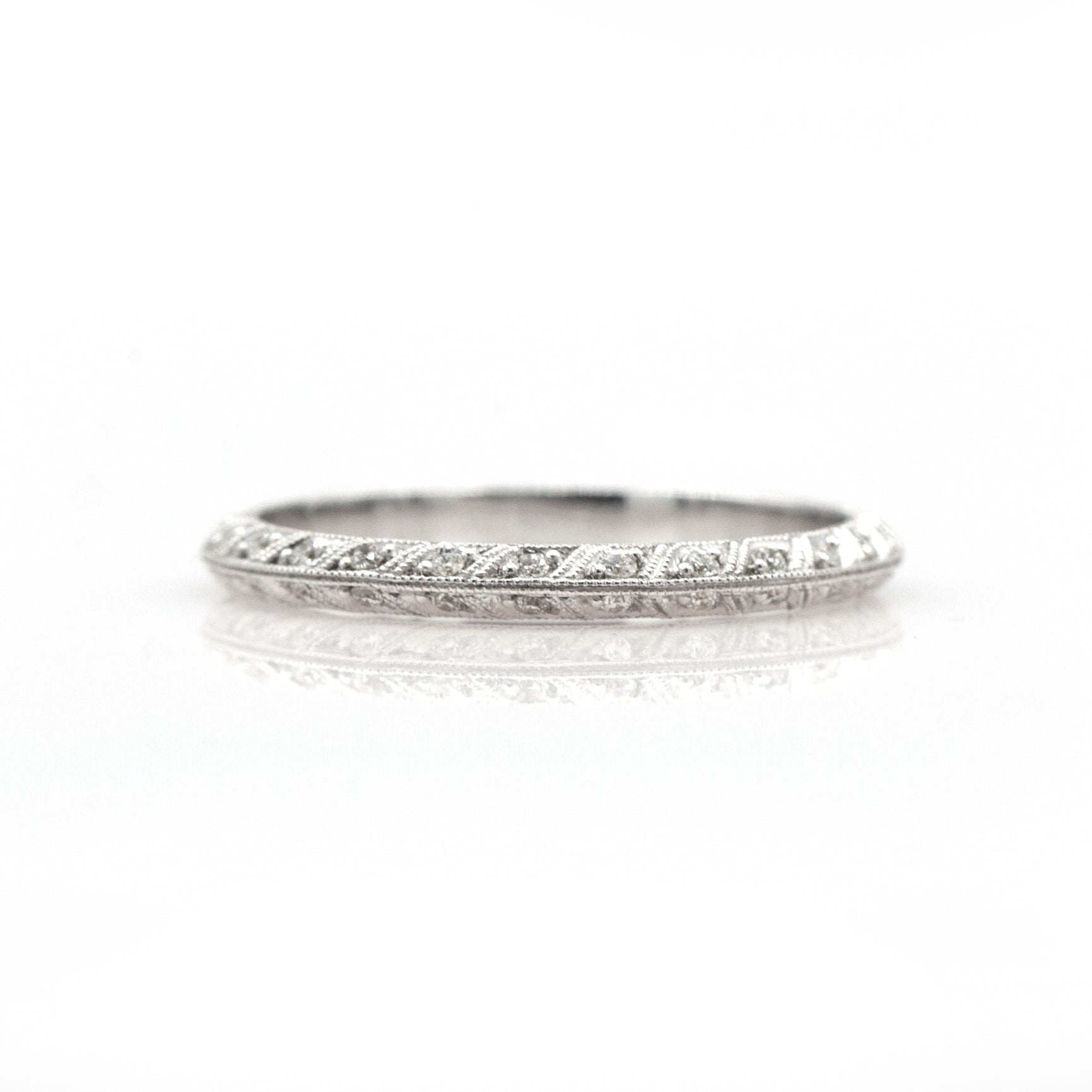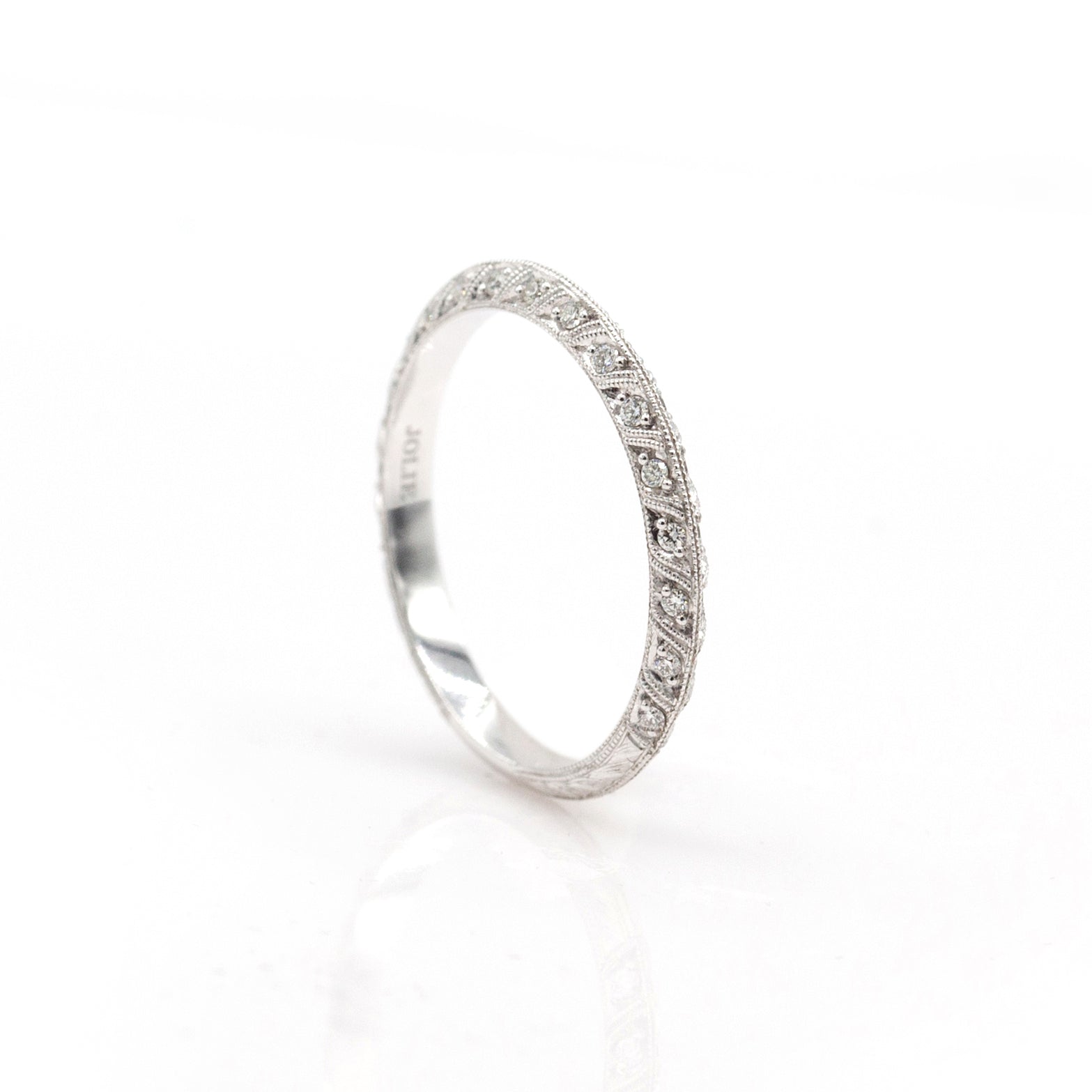14k White Gold Diamond Pave Set Stackable Band, round brilliant diamonds set half-way around and fine millgraining.