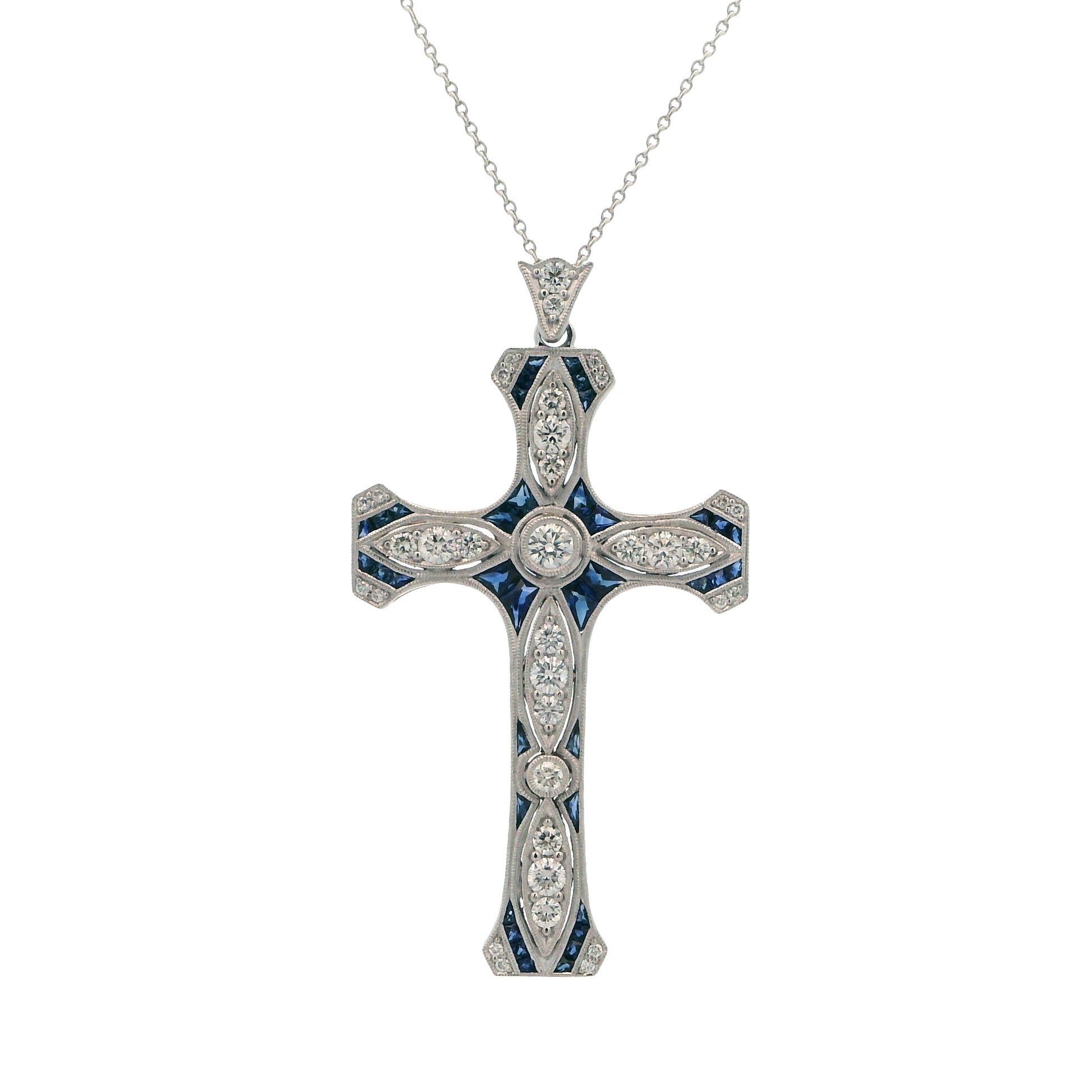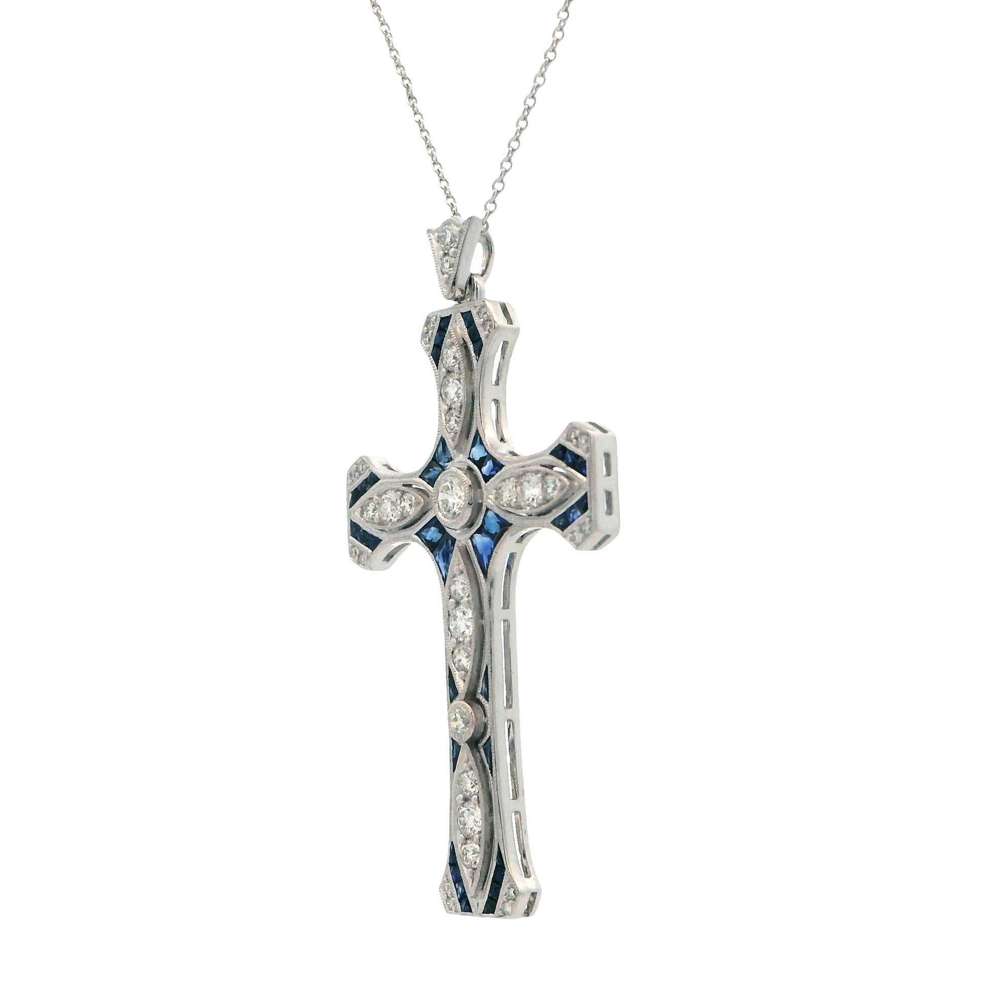 14k White Gold Art Deco Inspired Cross with 0.69ctw custom cut Blue Sapphires and 0.63ctw round brilliant Diamonds with fine milgraining detail.
