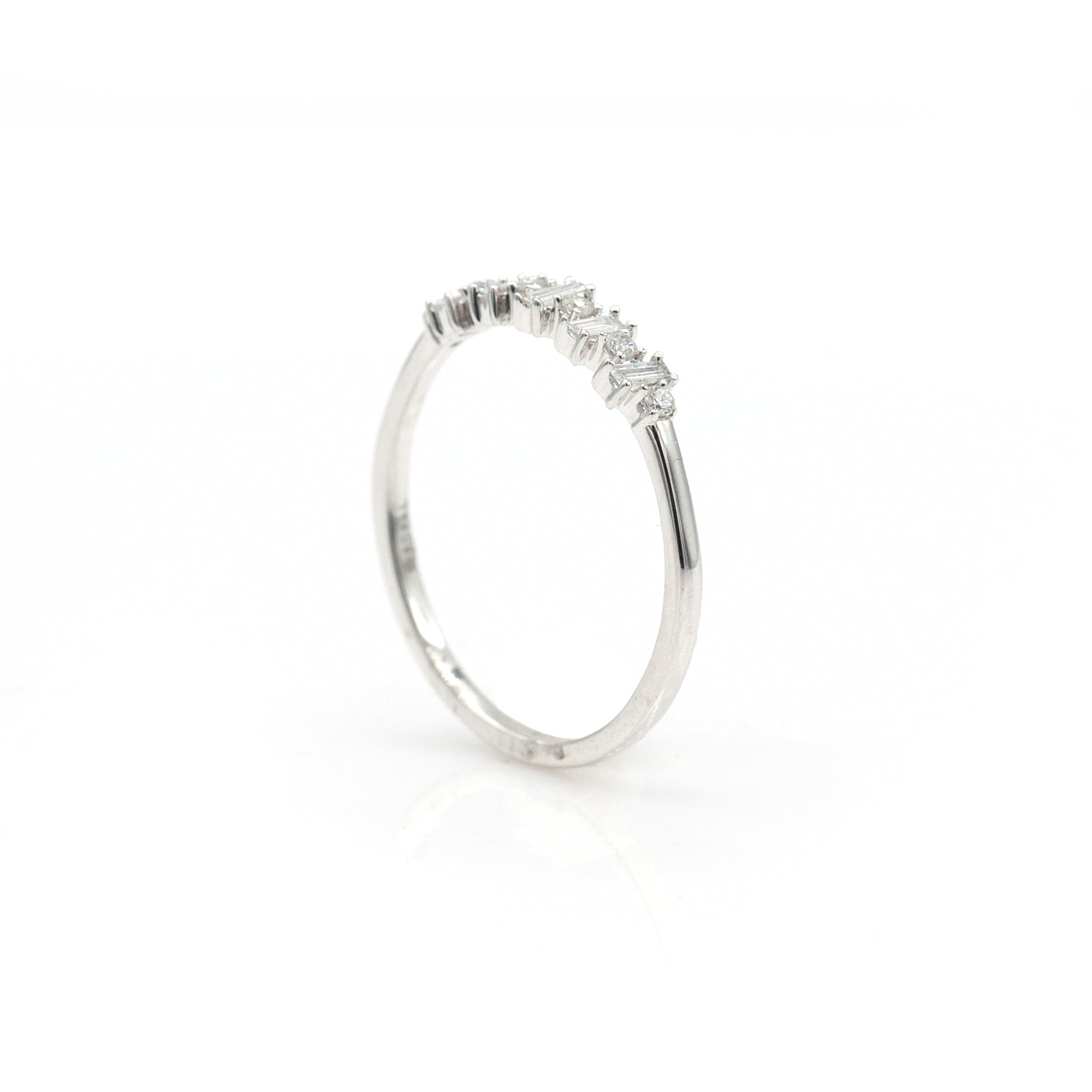 14k White Gold Diamond shapes band, with .16ct total weight baguette and round brilliant Diamonds