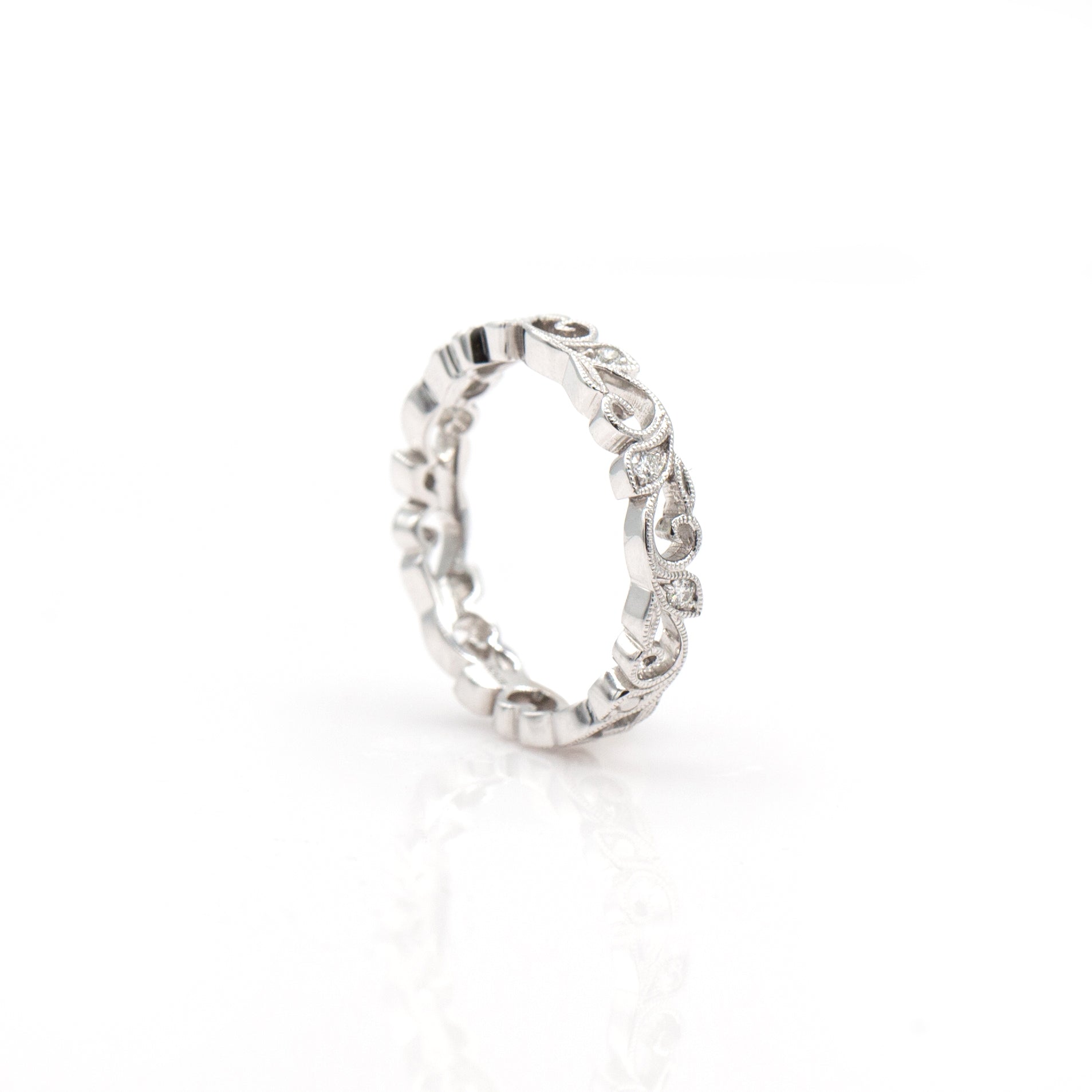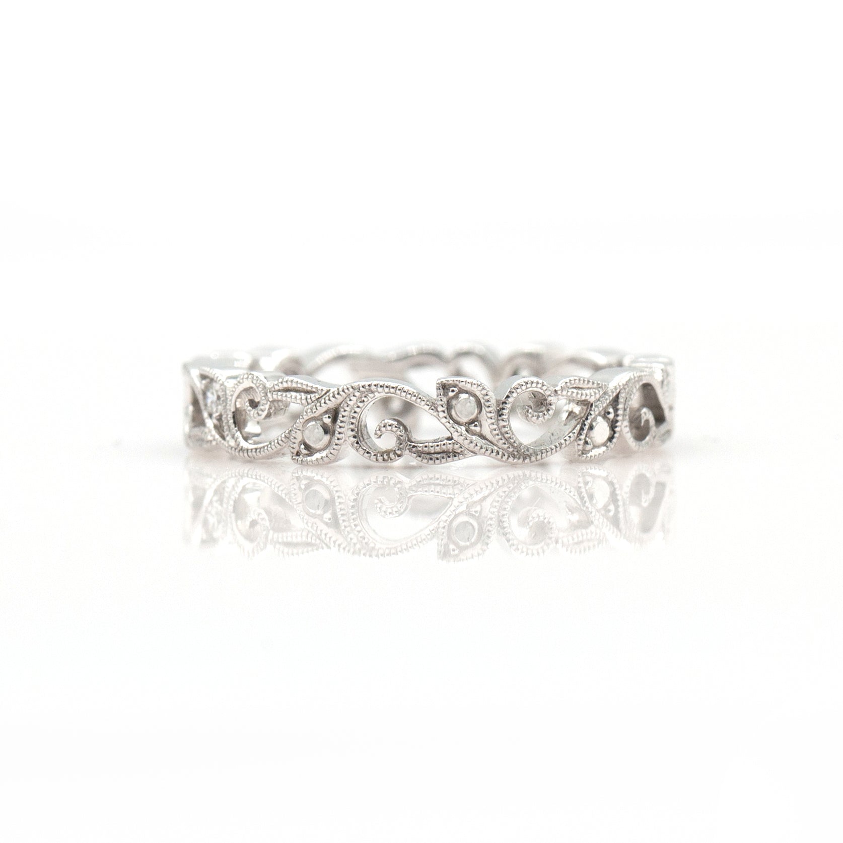 14k White Gold vines and leaves band, with round brilliant cut Diamonds half-way around. Detailed with a milgrained edge and high polished bottom.