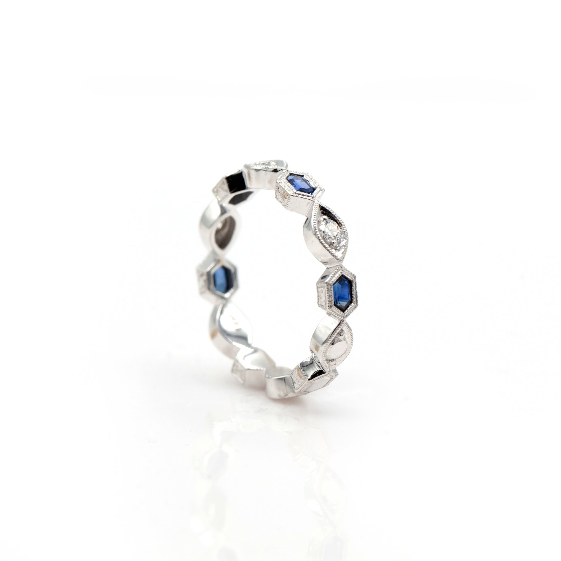 14k White Gold Stackable Band, with custom cut hexagon shaped sapphires & round brilliant Diamonds set halfway around, detailed with a milgrained edge.