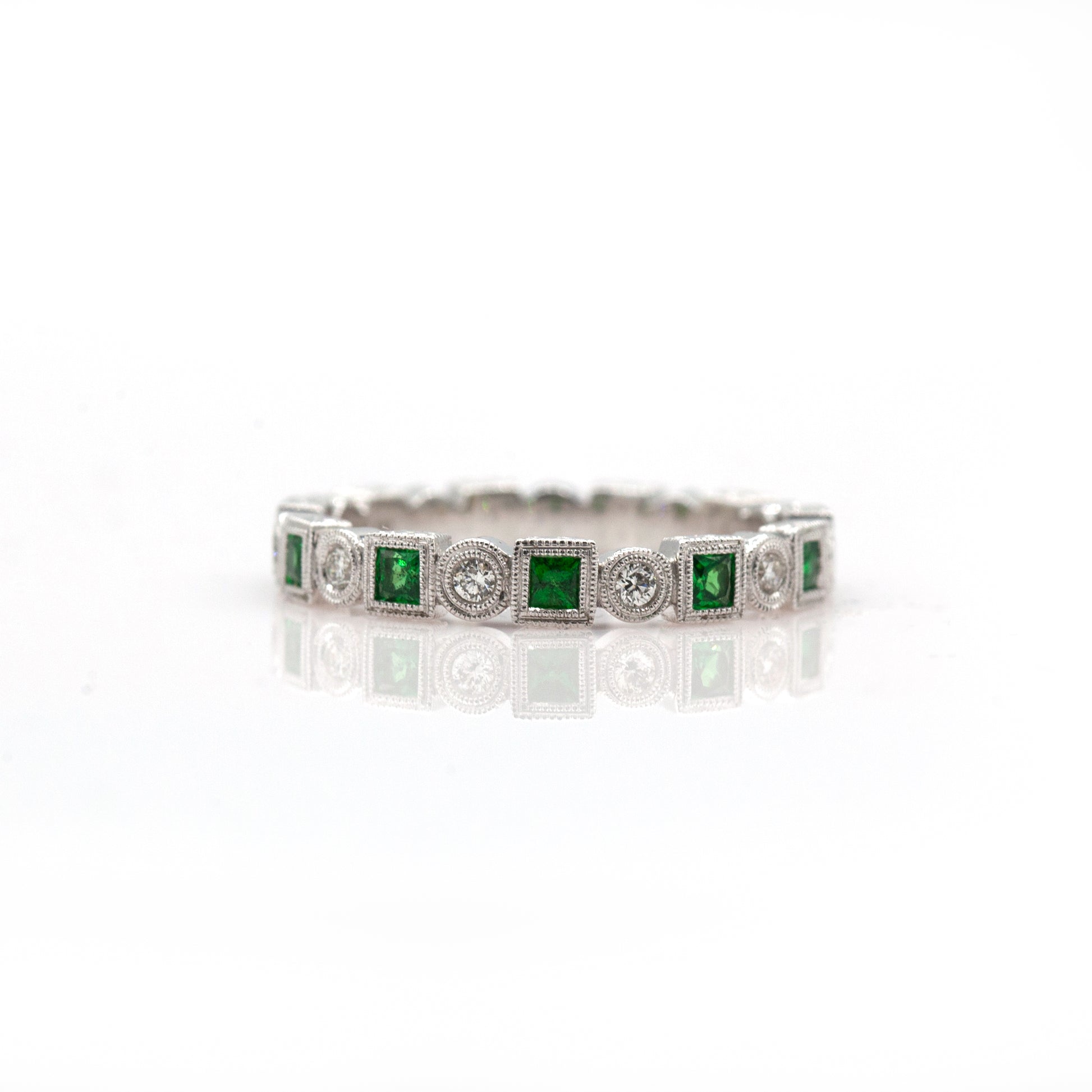14k White Gold Stackable Band, with princess cut Tsavorite Garnets & round brilliant Diamonds bezel set half-way around, detailed with a milgrained edge.