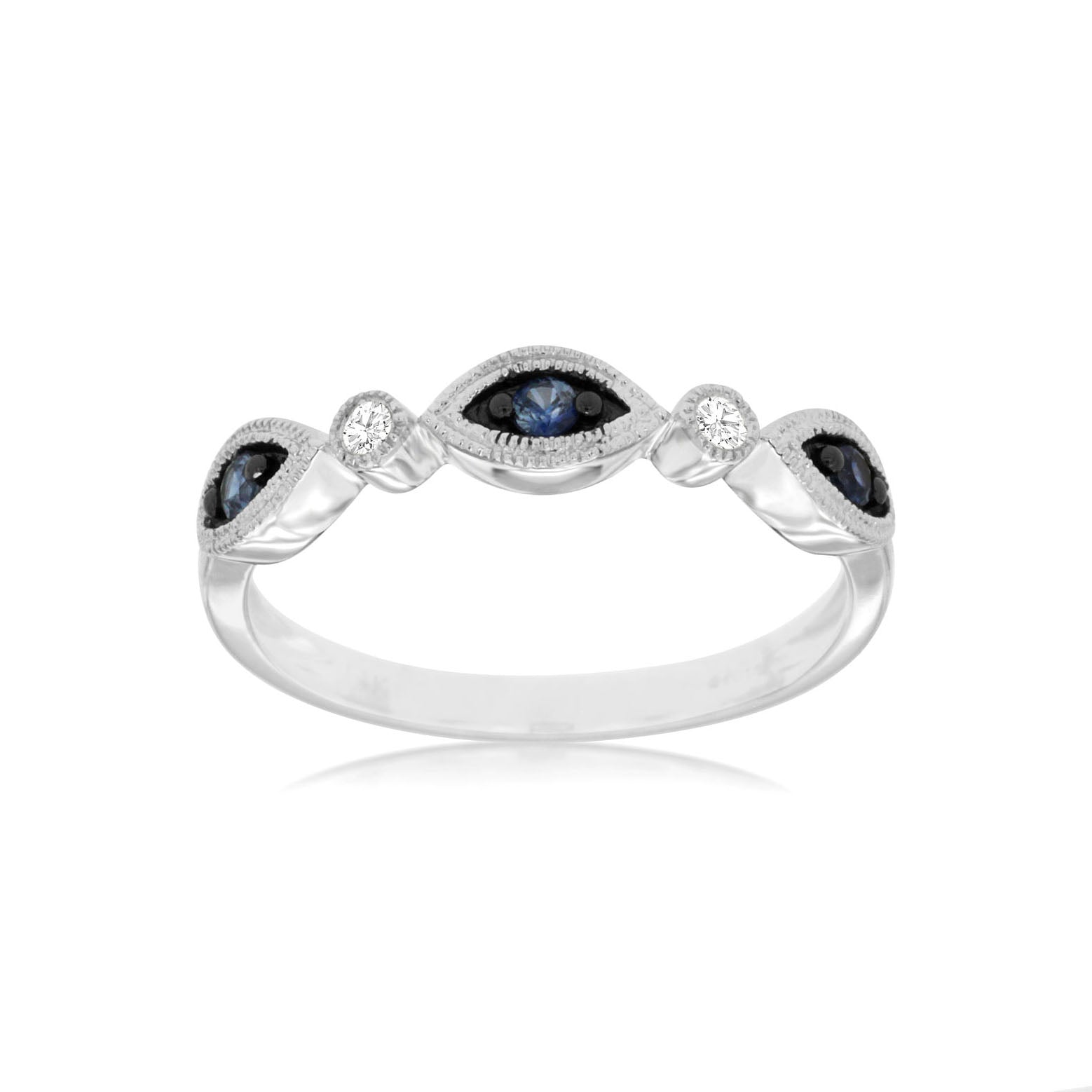 Crafted from 14K white gold featuring sapphires and diamonds with milgrain detailing adding a vintage-inspired touch. Perfect for stacking or wearing alone.