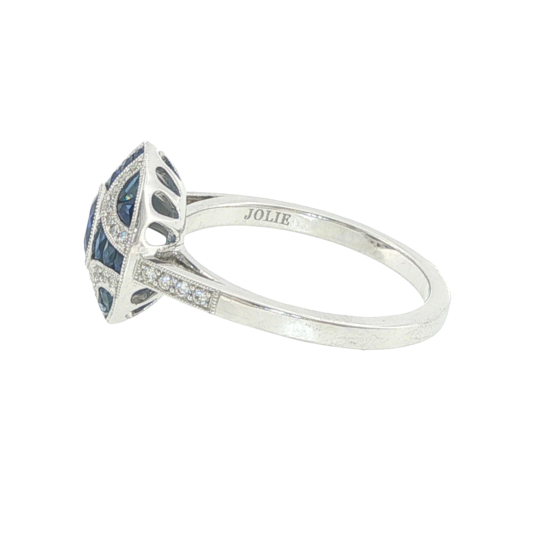 14k White Gold Hand Engraved Art Deco inspired Sapphire & Diamond ring