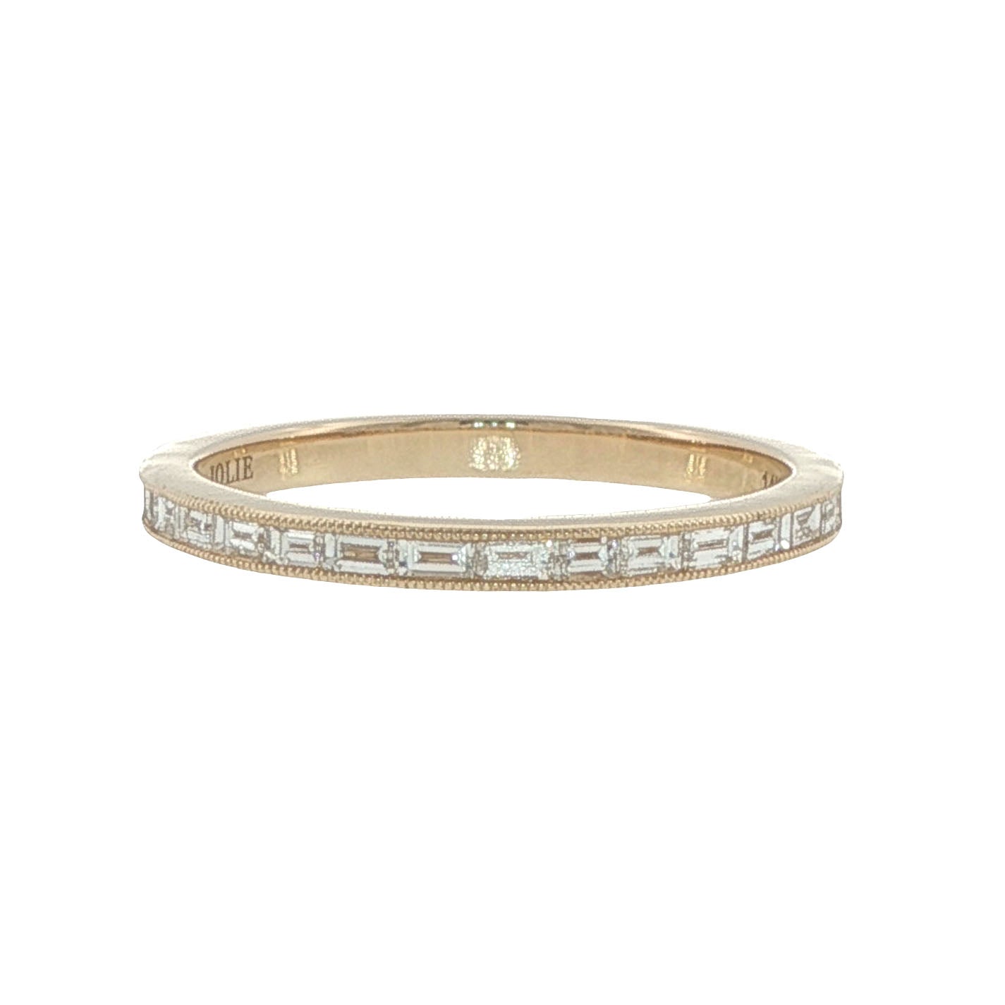 14k Yellow Gold Diamond Stackable Band, baguette diamonds set half-way around and fine millgraining.