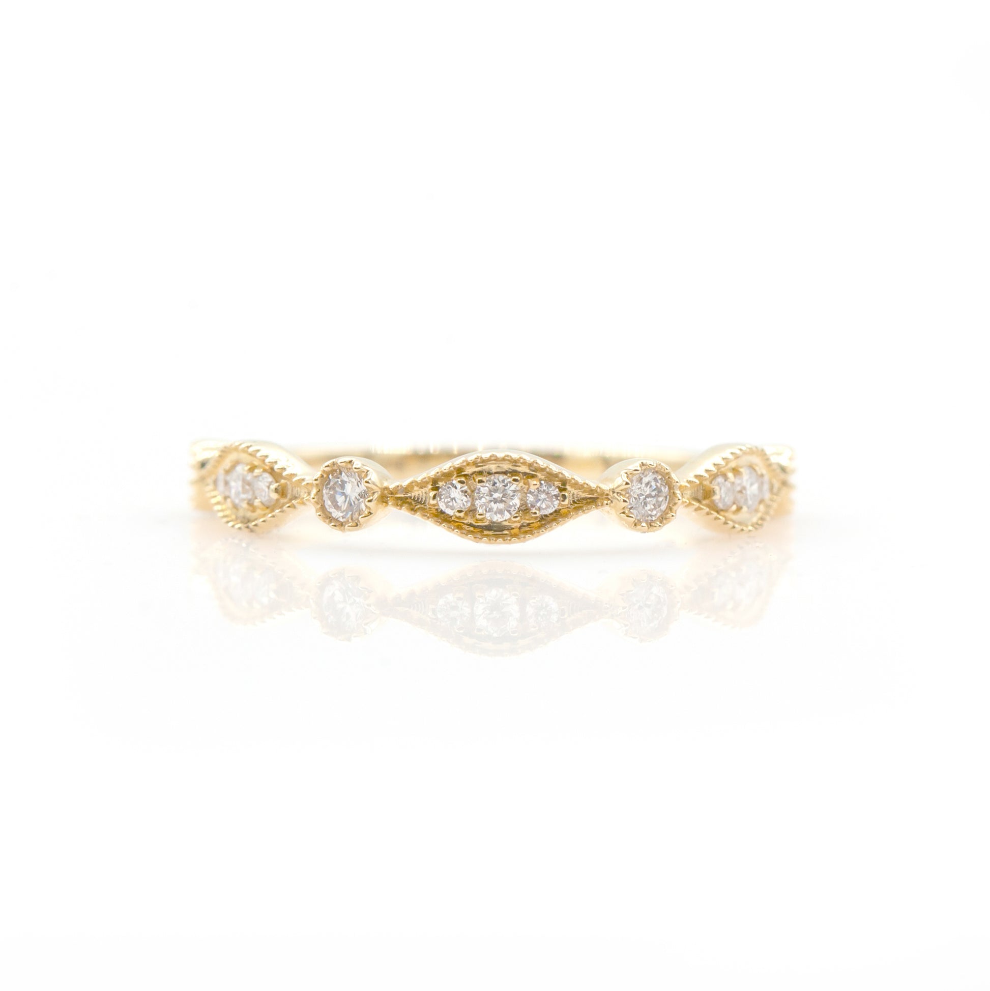 14k Yellow Gold Diamond shapes band, with .20ct total weight round brilliant Diamonds set halfway around. Detailed with a milgrained edge.