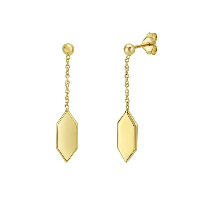 14k Yellow Gold Earrings, with gold hexagons dangling from chains on posts