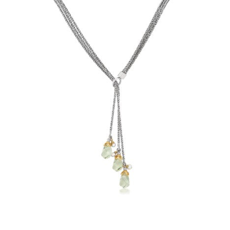 Sterling Silver & 18K Vermeil Necklace with three Green Amethyst briolettes with gray pearl charm accents. Three strand foxtail lariat, opening approx.15.5-20”, drops at 18”-23”