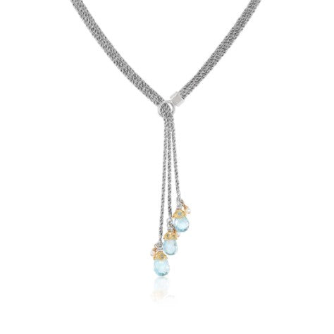 Sterling Silver & 18K Vermeil triple strand lariat with three blue topaz briolettes and freshwater gray pearls