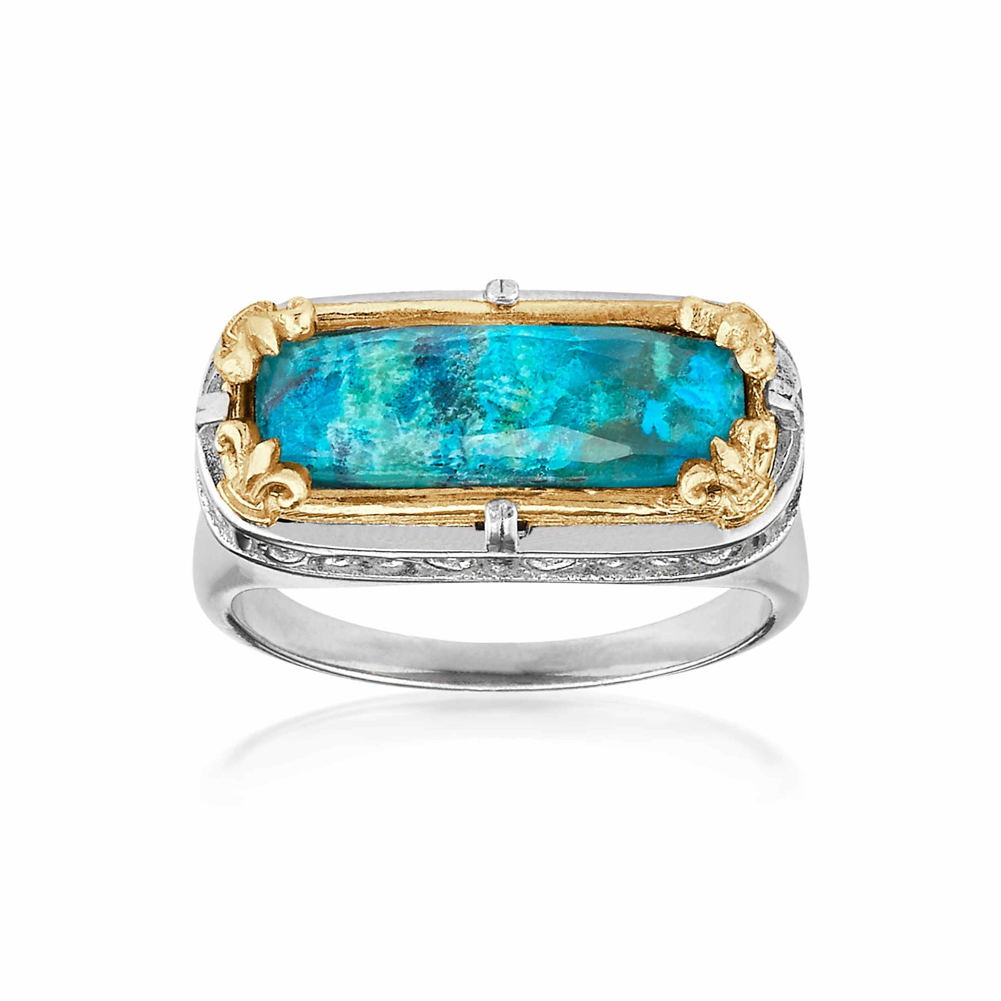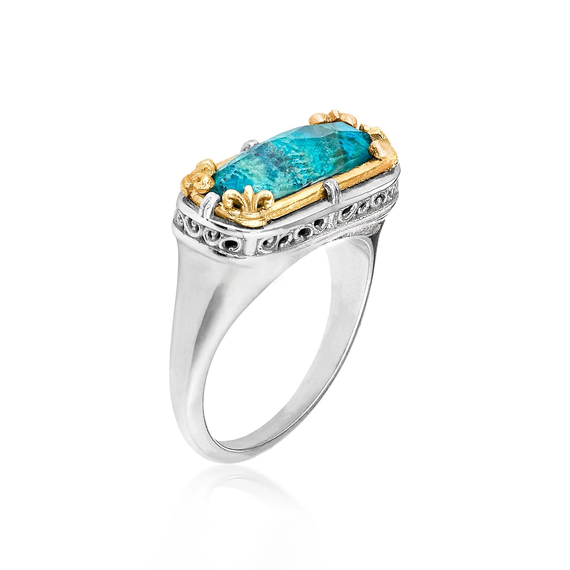 Sterling Silver & 18k Vermeil Ring with 5x15mm Chrysocolla doublet, layered with beautifully faceted clear Quartz.