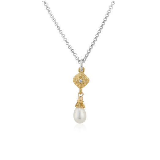 Sterling Silver & 18K Vermeil Pendant with a diamond-shaped pendant with a White Sapphire and Pearl Teardrop.
