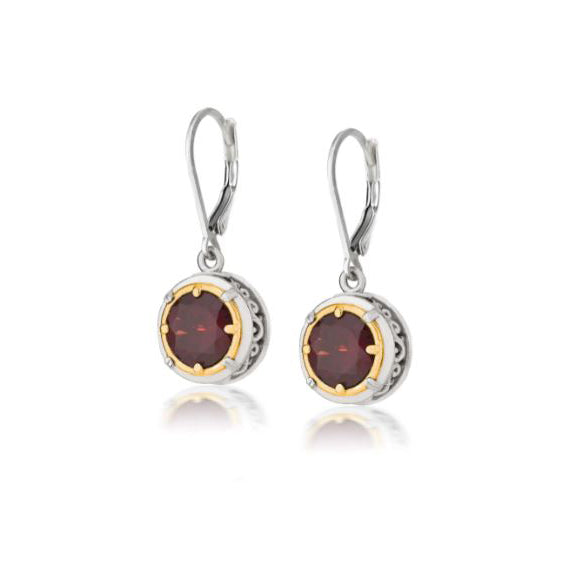 Rhodium plated Sterling Silver with 18k Gold Vermeil with 8mm Garnets on leverback ear wires