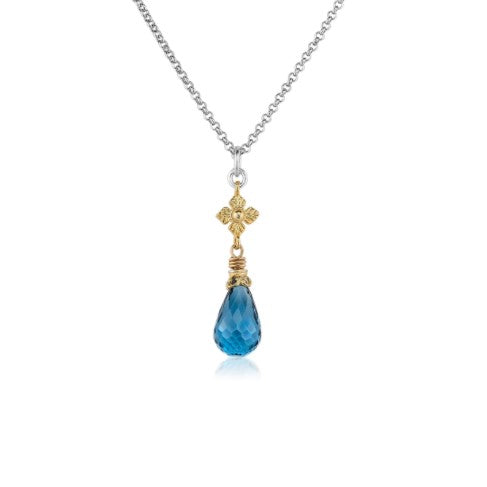 Sterling Silver & 18K Vermeil Pendant with a multi-faceted 11x7mm London Blue Topaz hanging from a flower pendant.