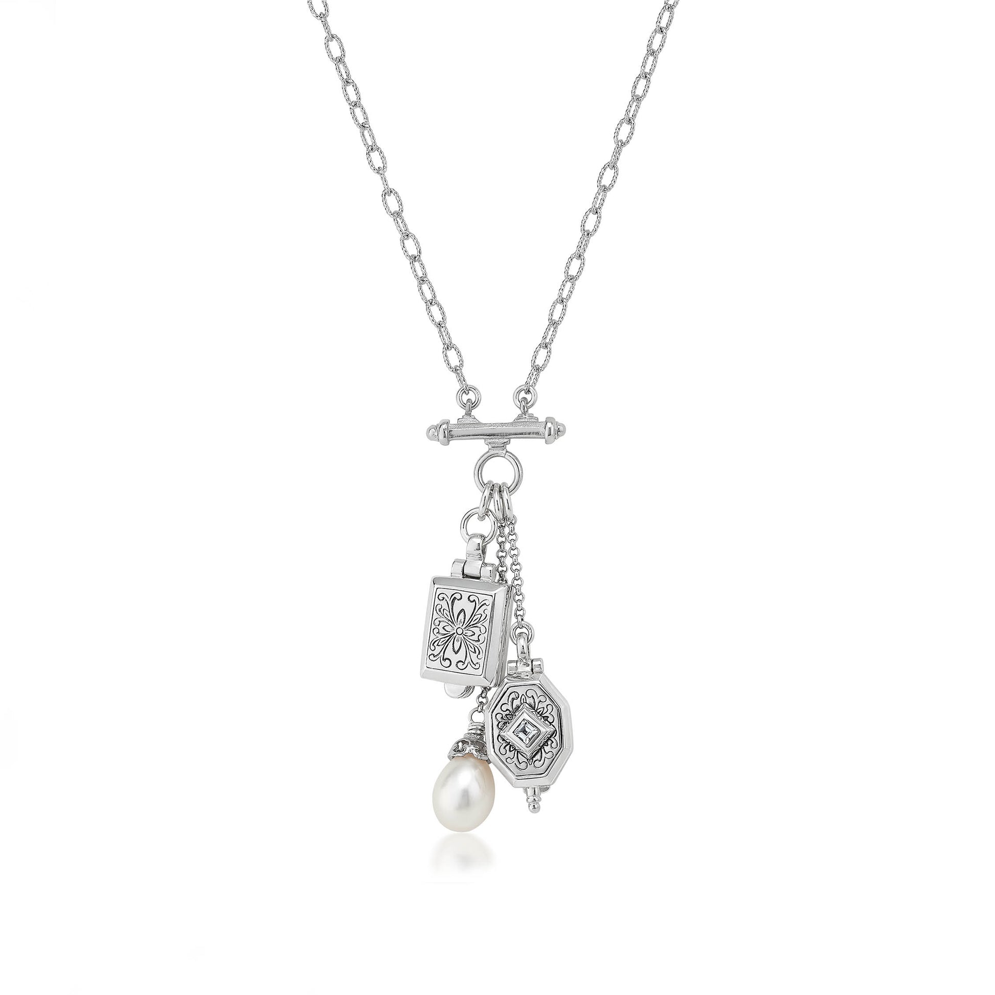 An Engraved 12x21mm Double-Sided Octagonal Sterling Silver White Topaz Locket and a 12/18mm Engraved Double-Sided Rectangular Locket with a 5-9mm Freshwater Pearl Teardrop Dangle.