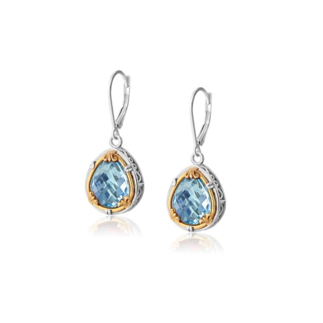 Sterling Silver & 18K Vermeil beautifully faceted 10x8mm Blue Topaz Teardrops on leverback ear wires.