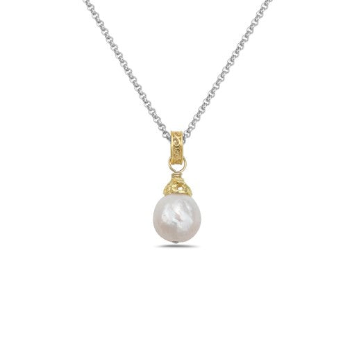 Sterling Silver & 18K Vermeil 10mm Baroque pearl necklace on a 16-18" sterling silver rolo chain chain.