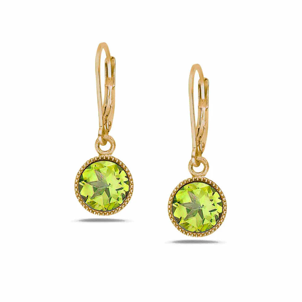 Sterling Silver & 18K Vermeil 7mm round Peridots hanging from gold-filled lever-back ear wires.