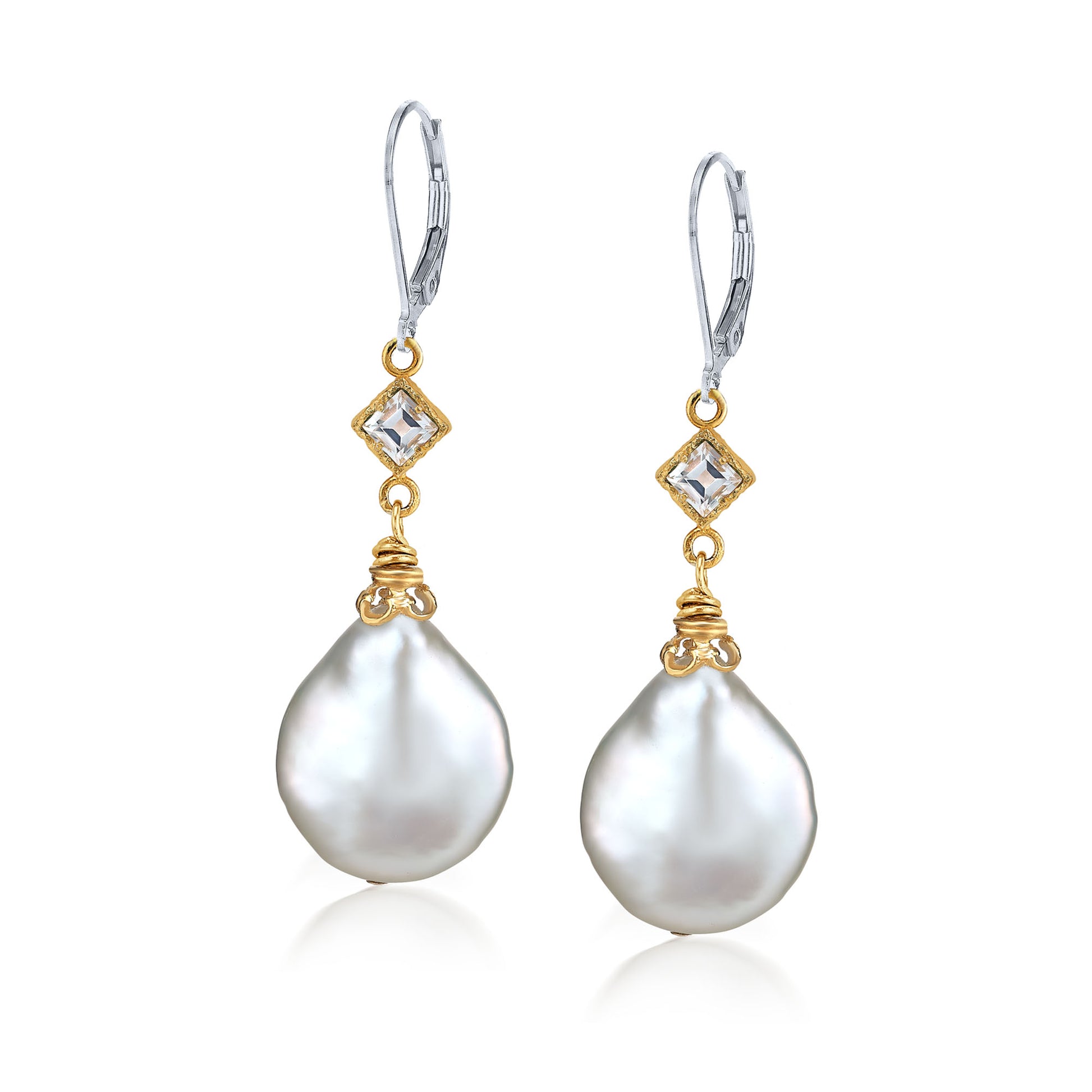 Sterling Silver & 18K Vermeil 14-16mm Baroque Coin Pearls hanging from beautiful 3mm White Topaz leverback earrings.