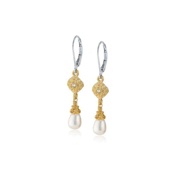 Sterling Silver & 18K Vermeil Freshwater Pearls hanging from a discs with White Sapphires.