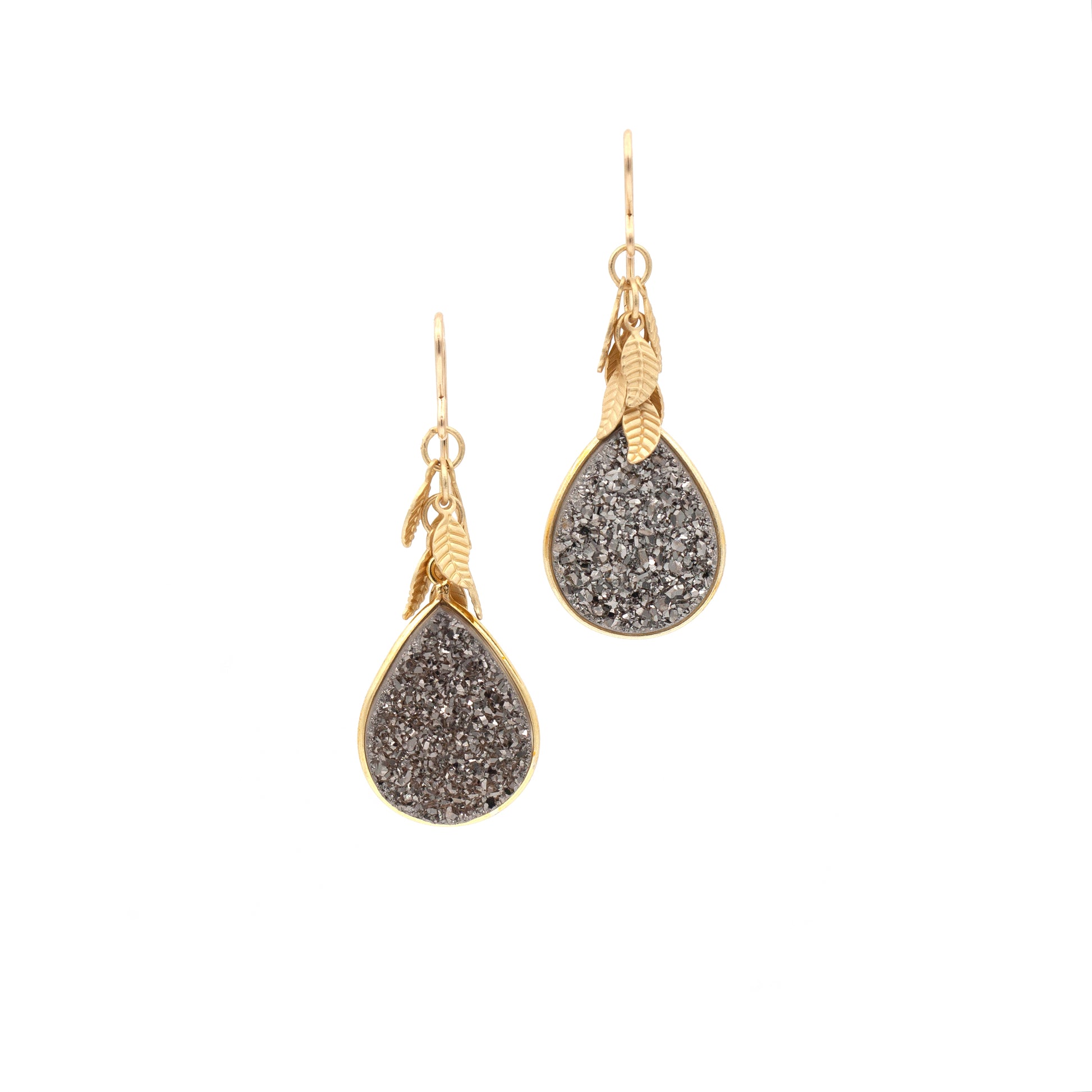Gray Druzy Quartz & 14K Gold-Filled Leaf Dangle Earrings