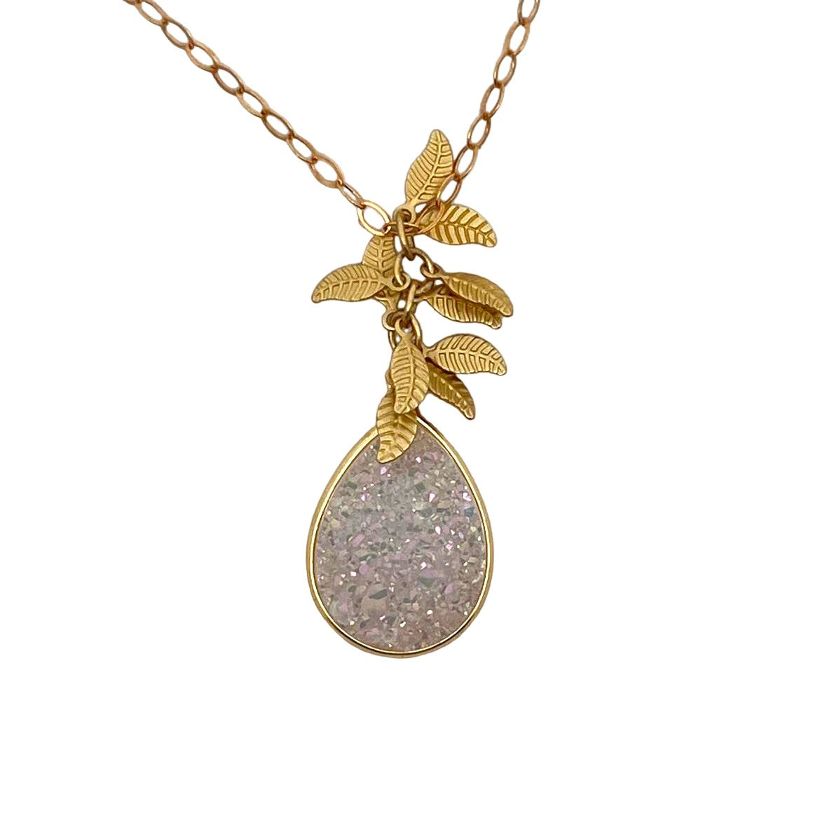 White Druzy Quartz & 14K Gold-Filled Leaf Pendant