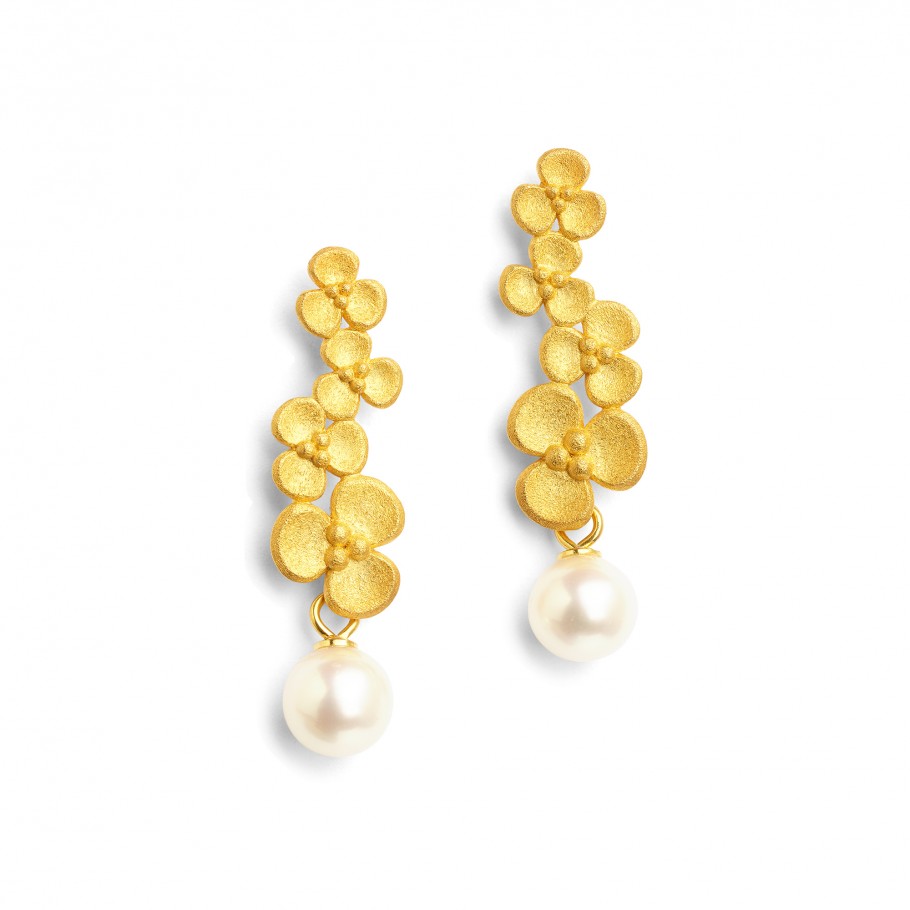 24k Gold-Plated Sterling Silver flower post earrings with a dangling Pearl