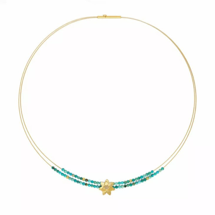 24k Gold-Plated Sterling Silver two strand Blue Turquoise Necklace with a cubic zirconia accented center flower.