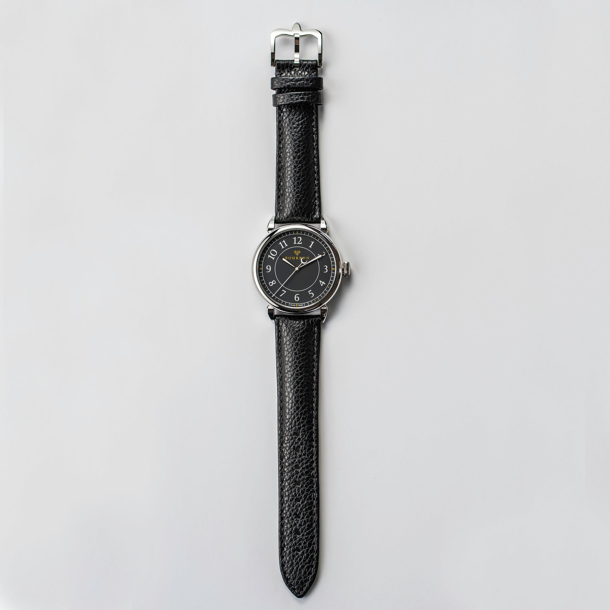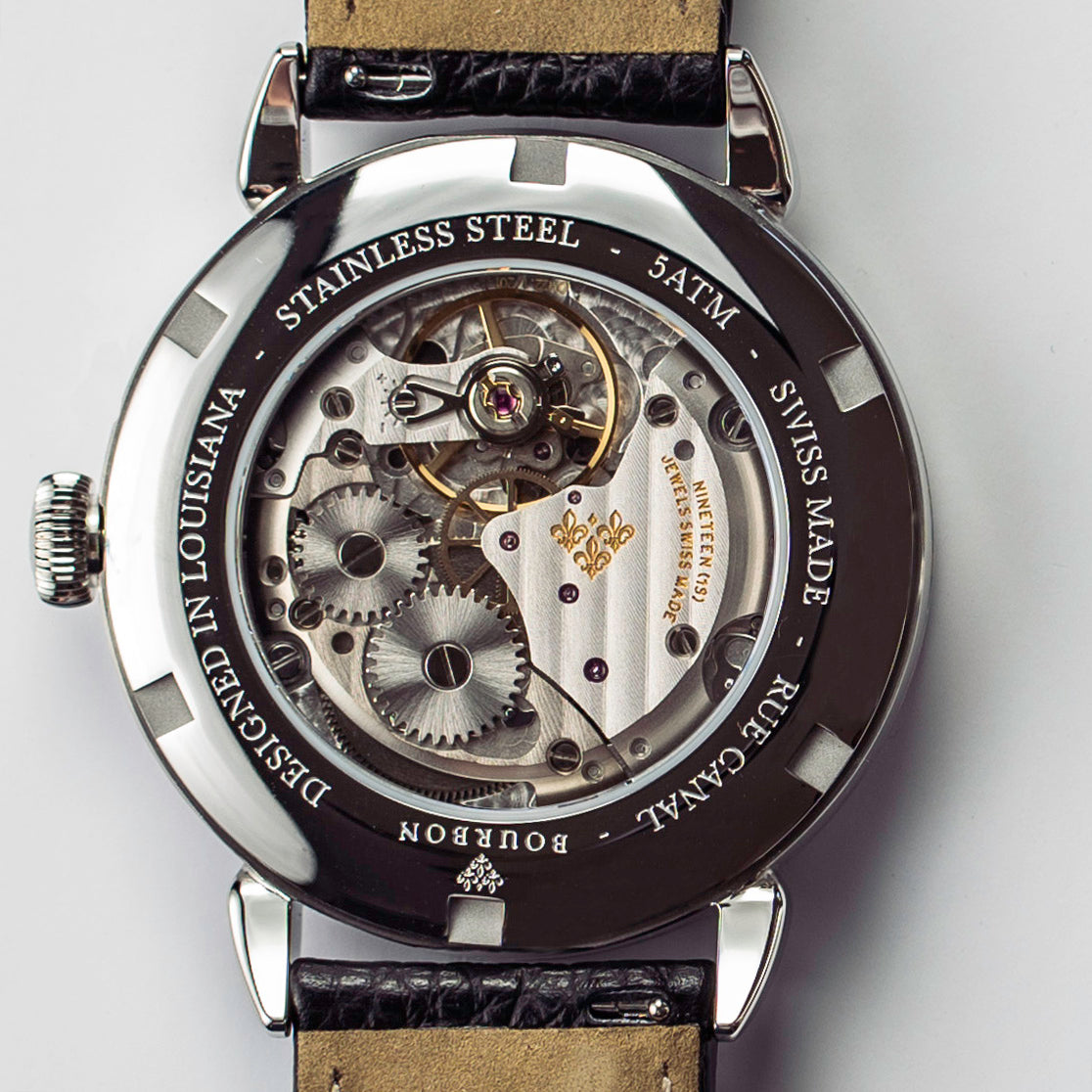 Moonlight white printing lights this dial inspired by New Orleans after dark. Warm flickers of gold glow like the gas lanterns that line the streets of the Vieux Carré. The watch is encased in a vintage-inspired 39mm stainless steel case with teardrop-shaped lugs, a hallmark of mid-century Swiss design, and used here to evoke the ornamented tops of the iron gates found throughout the French Quarter.