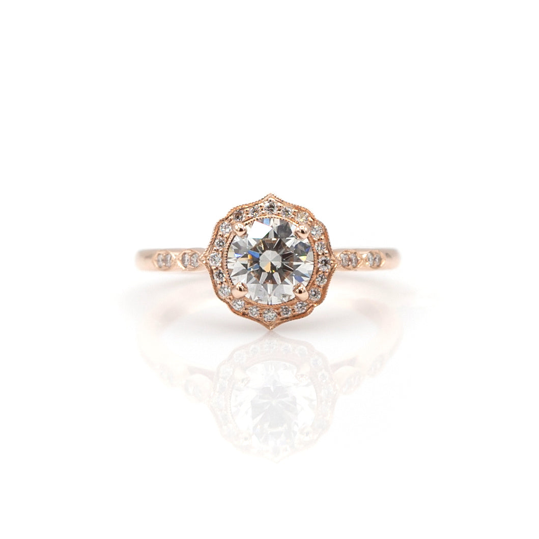 14k Rose Gold Halo setting, with milgrain detail and high polished finish. Size 6.5