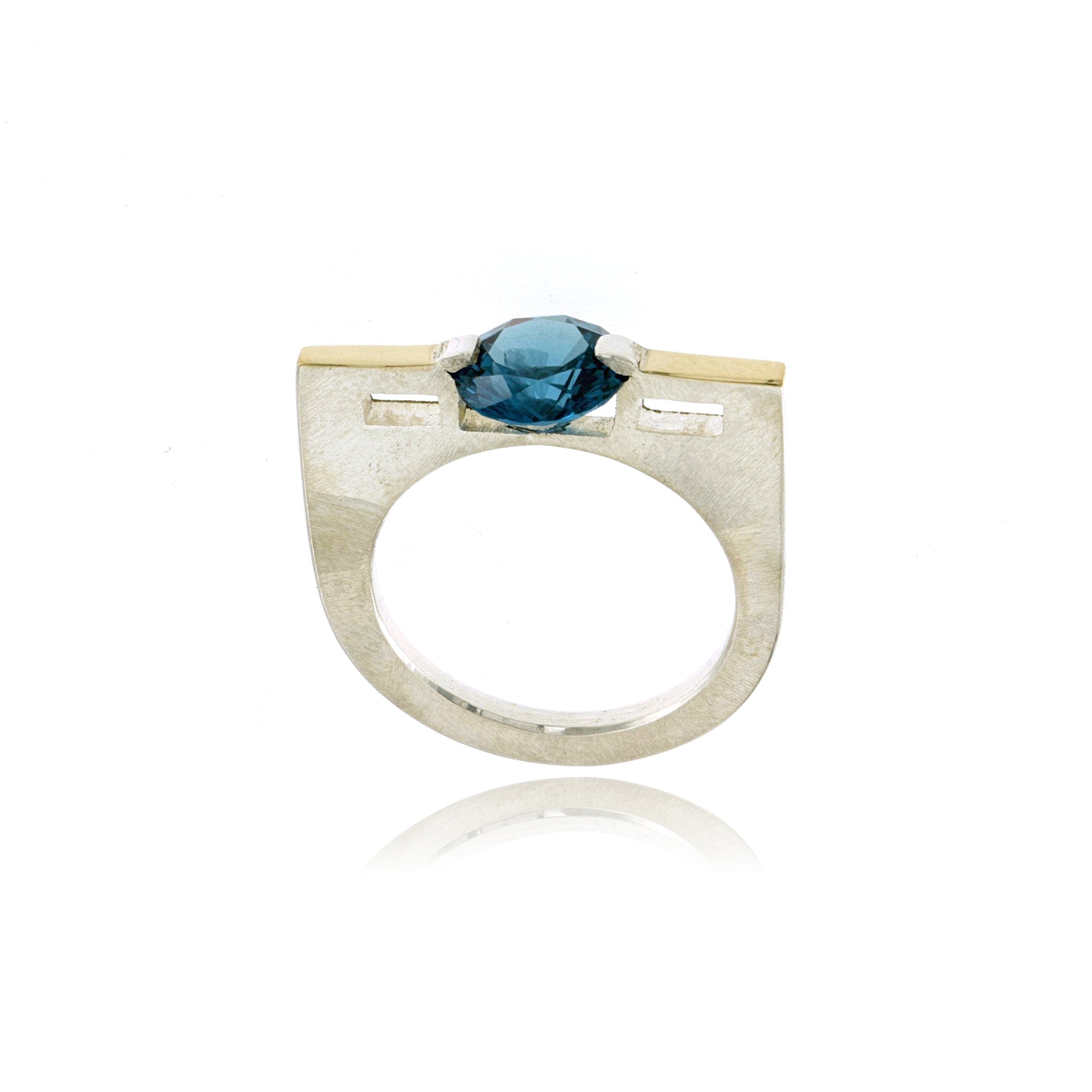 Sterling Silver textured ring with an 8mm round lab-created London Blue Spinel, tension set in an asymmetrical sculptural style with 14k Yellow Gold.