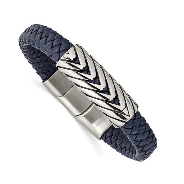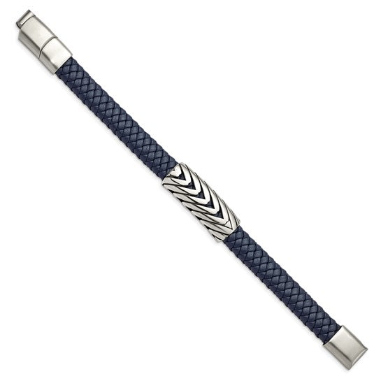 Stainless Steel Antiqued and Polished Blue Braided Leather Bracelet
