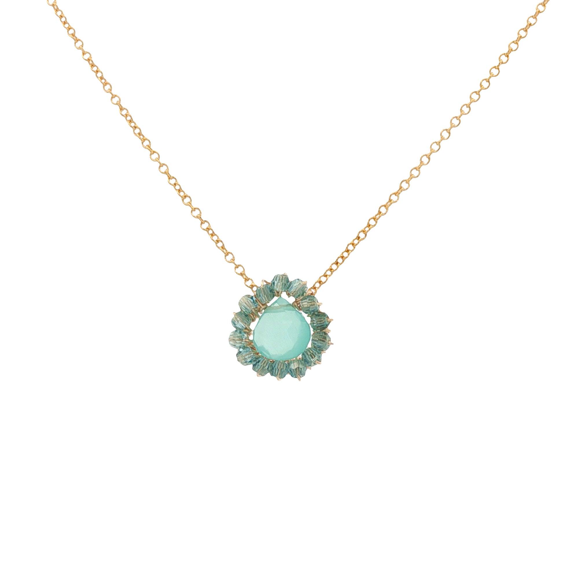 14K gold-filled wire wrapped Chalcedony & Crystal pendant hanging from a 16" chain. The pendant measures 2/5" circle