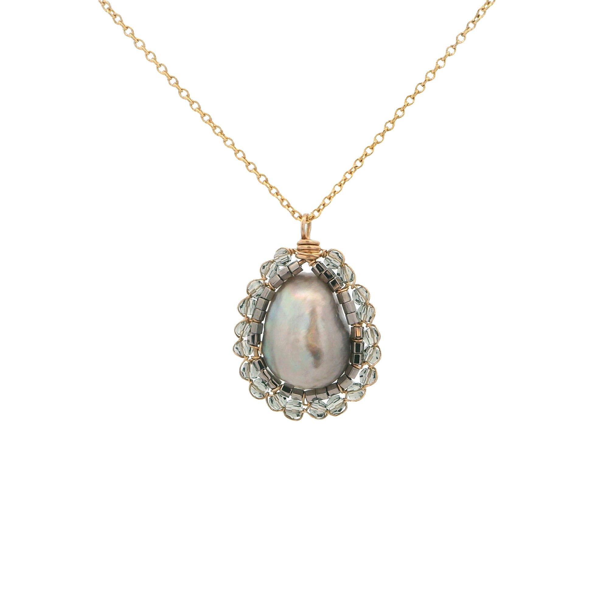 14K gold-filled wire wrapped Pearl & Crystal pendant hanging from a 17" chain. The pendant measures 7/8" x 3/4" long