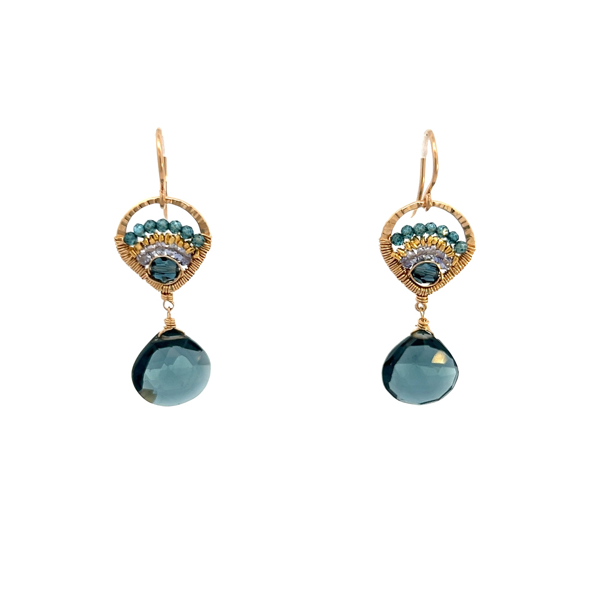 Handmade Earrings with London blue topaz and crystals wrapped with 14k gold-filled wire