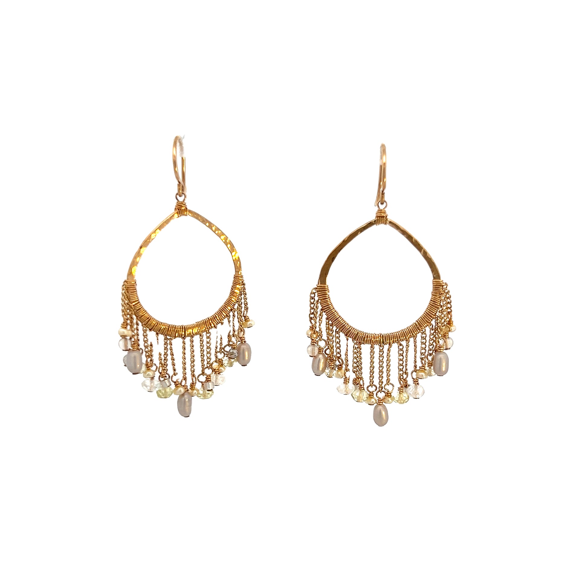 Handmade Earrings dangling seed pearls & crystals wrapped with 14k gold-filled wire on ear wires
