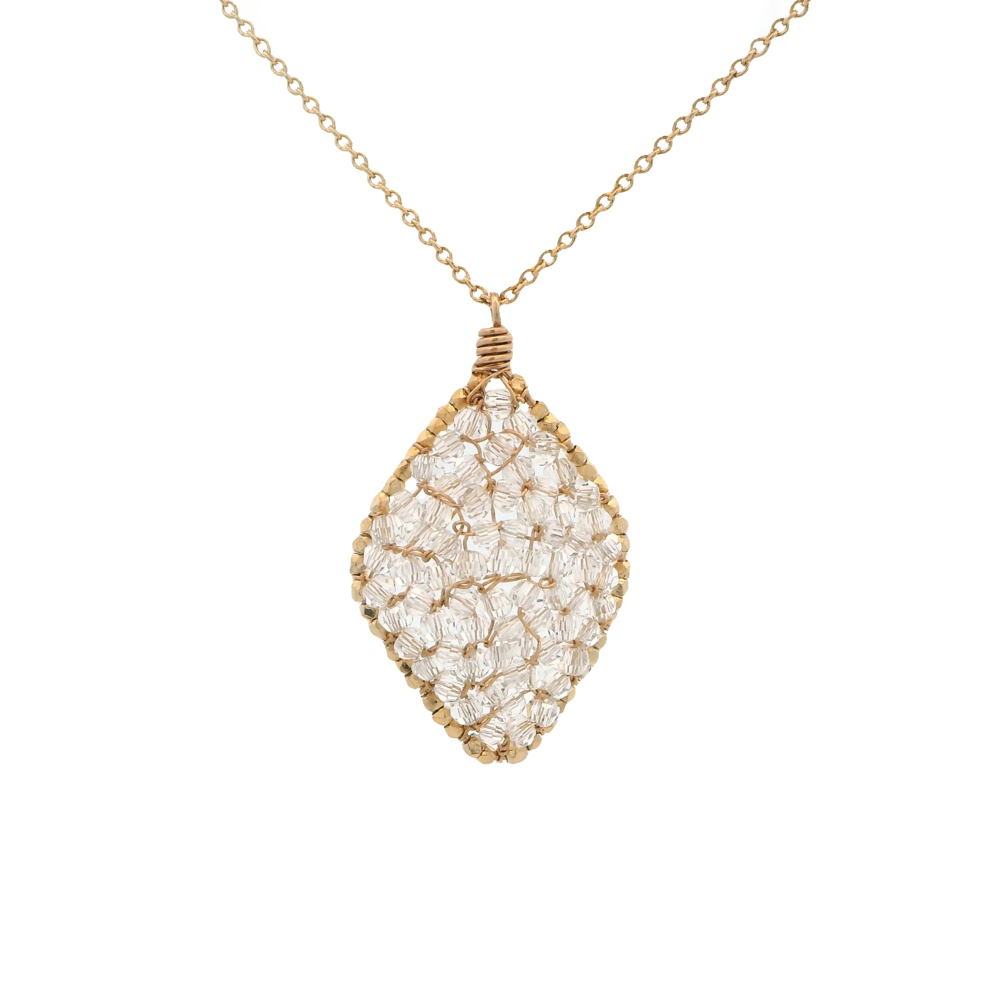 Shimmering crystals woven with 14K Gold-filled wire and encased in golden, faceted beads hanging from a 17" chain. The pendant measures 1" x 3/4" long