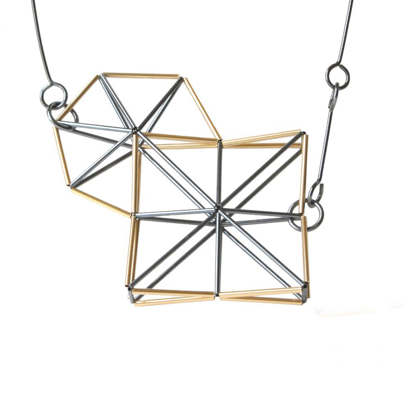 14K Gold-filled and oxidized sterling silver tubes, hand cut and assembled with gold-filled beads into beautiful geometric designs