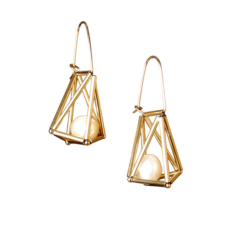 14K Gold-filled tubes, hand cut and assembled into beautiful geometric cage holding undrilled freshwater pearls.