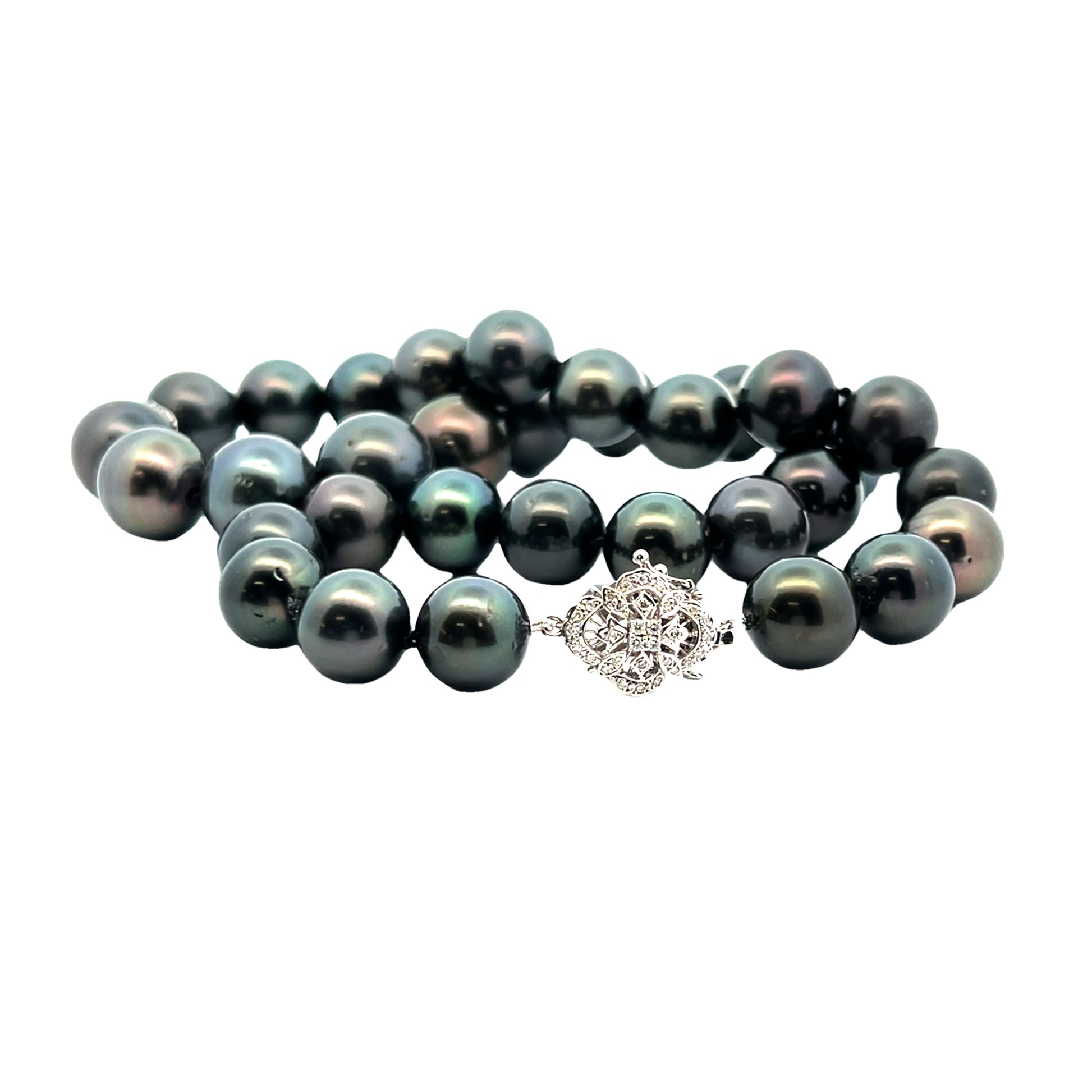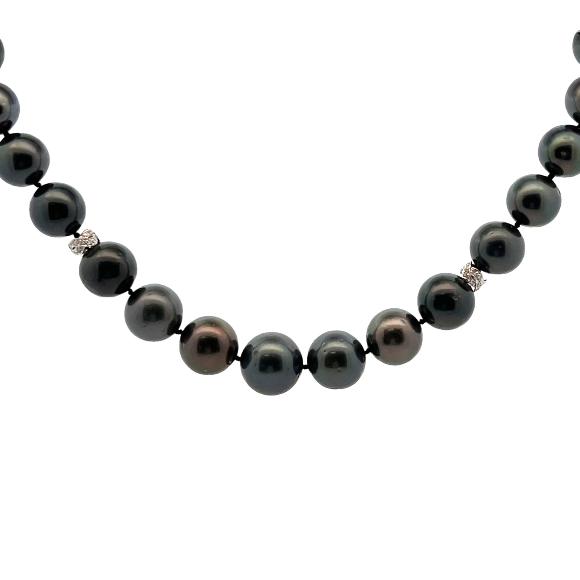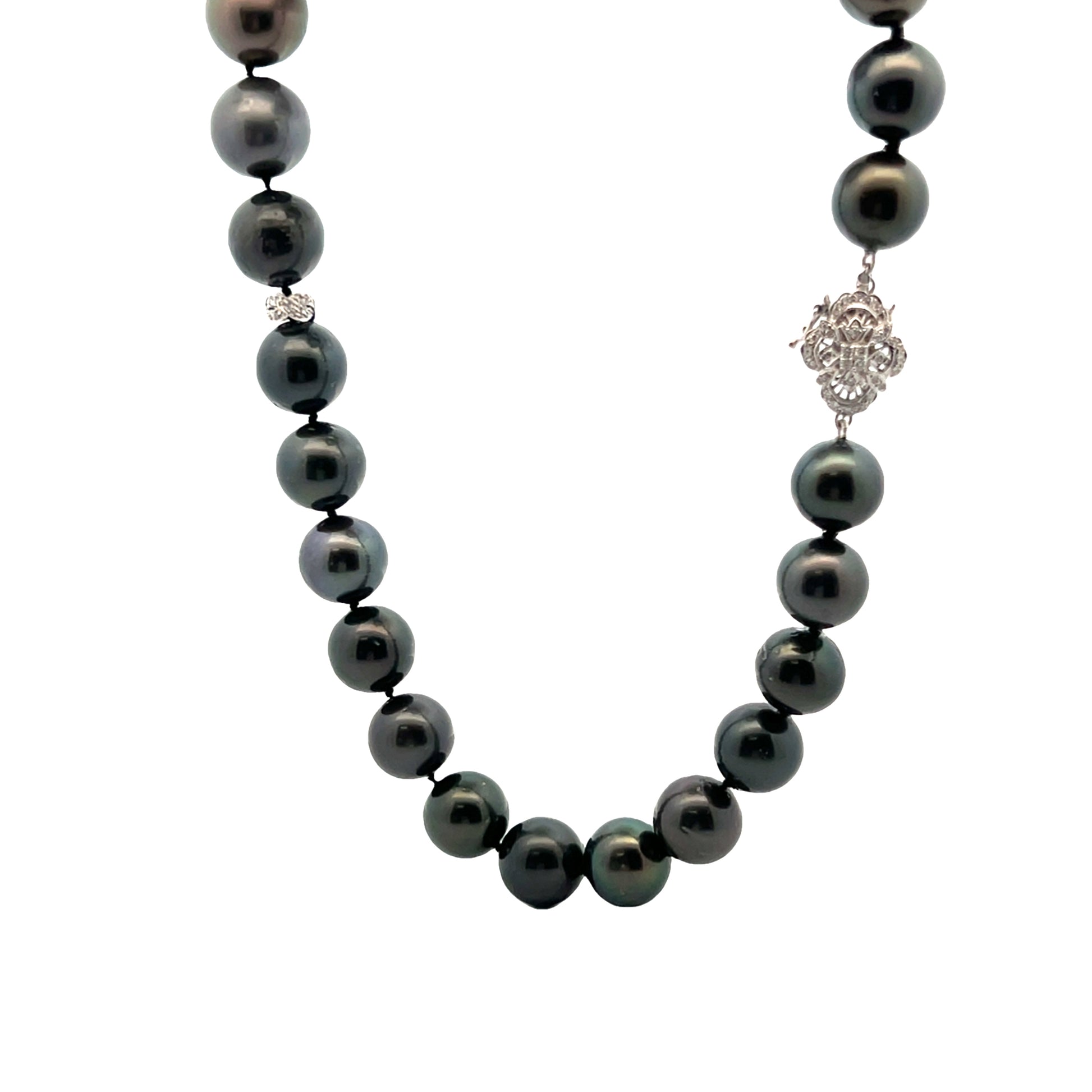 14K White Gold diamond clasp necklace with thirty-three graduated blue-green peacock color Tahitian Pearls accented with two diamond rondelles