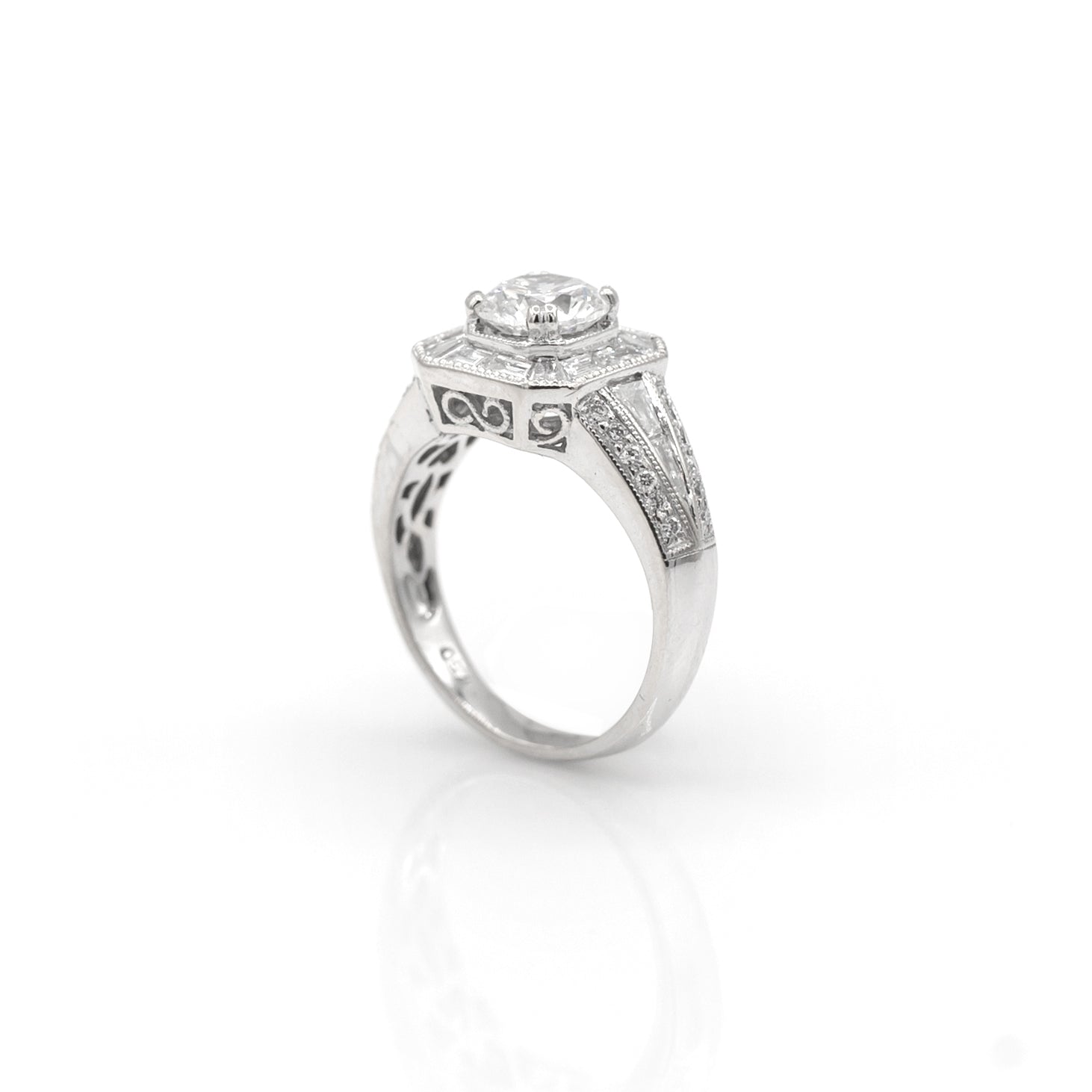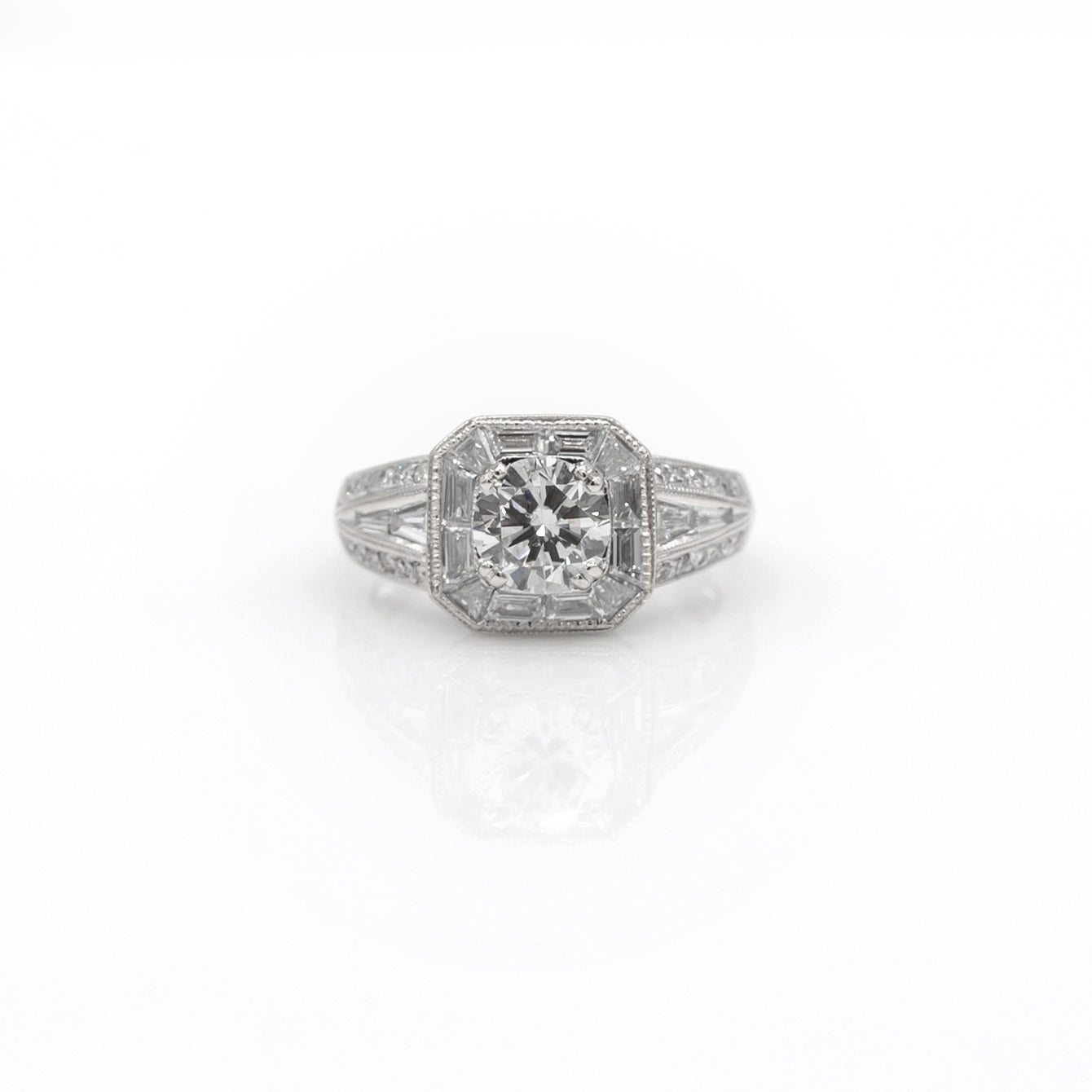 Estate Collection 18k White Gold baguette halo setting, with milgrain detail.