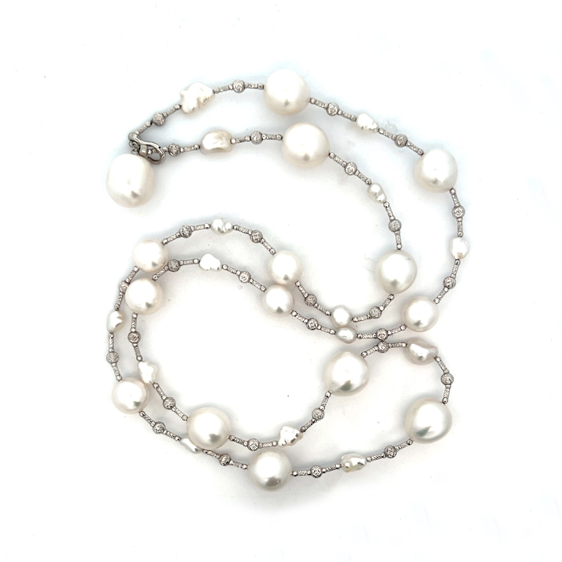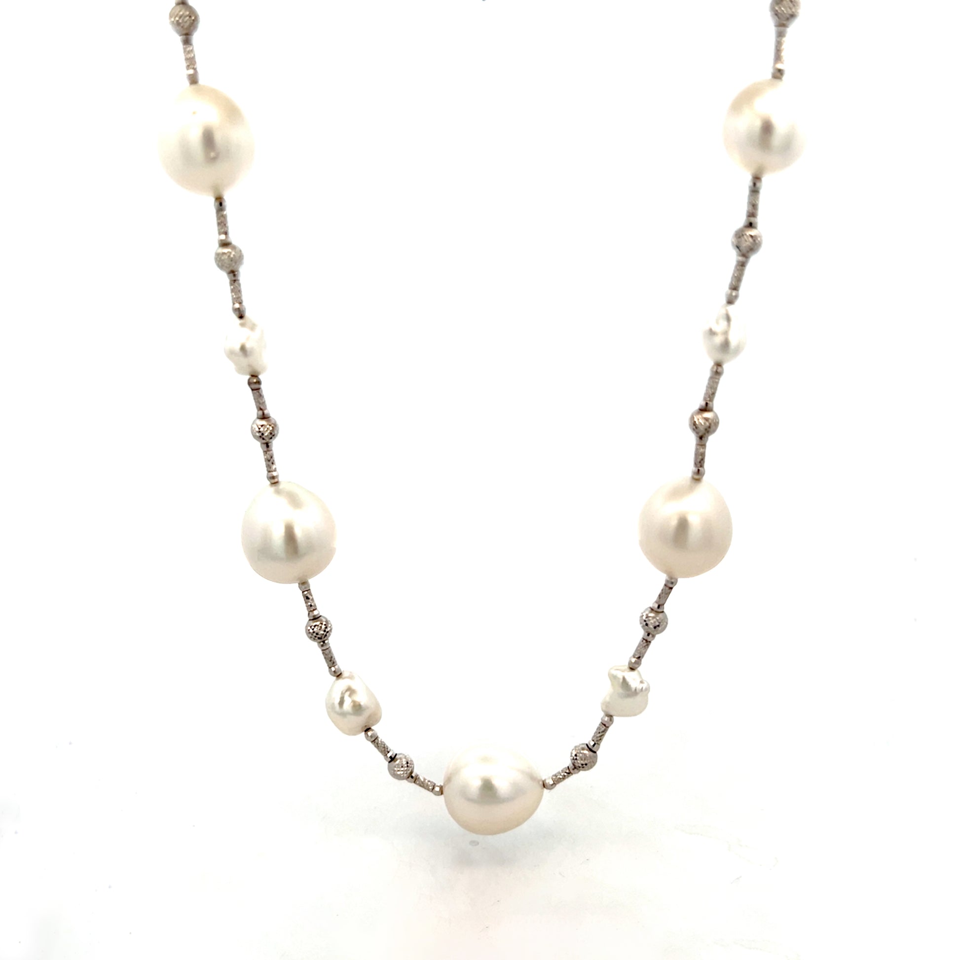 18K White Gold hand made necklace with fifteen South Sea Pearls and fifteen Freshwater Pearls on a sparkly diamond cut 30" chain