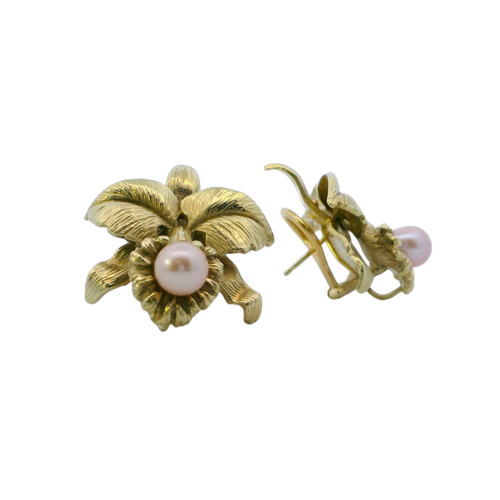 Estate Collection 18K Yellow Gold Orchid & Pearl Earrings